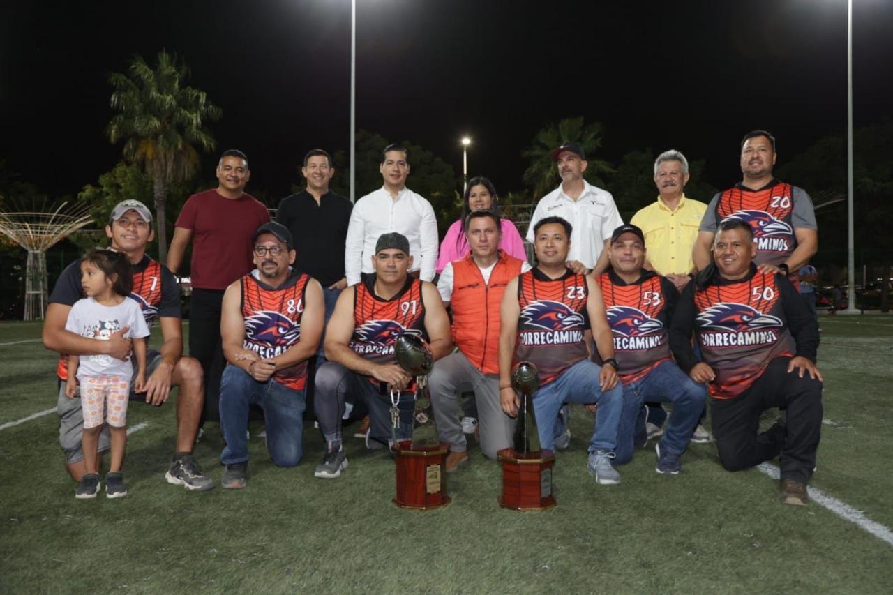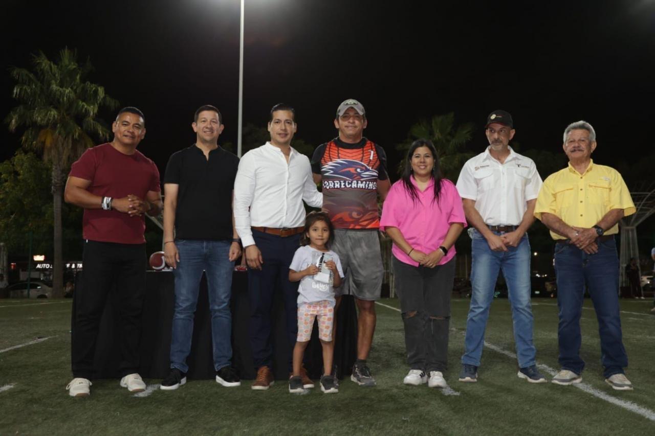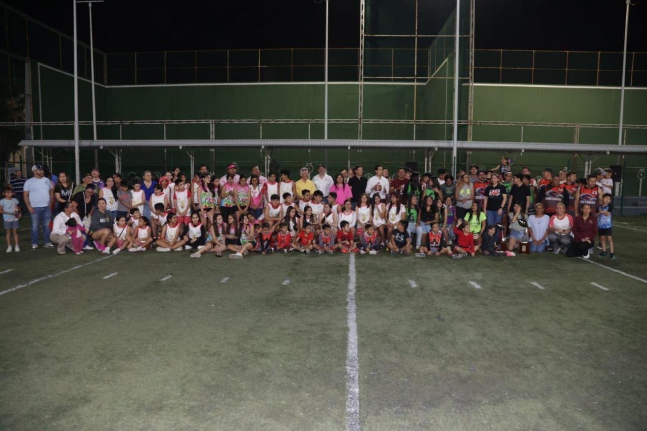 Ciudad Victoria, Tamaulipas.- El director general del Instituto del Deporte, Manuel Virués Lozano, encabezó la ceremonia de premiación a las y los campeones de la primera temporada del torneo de tochito flag, celebrado en Ciudad Victoria.