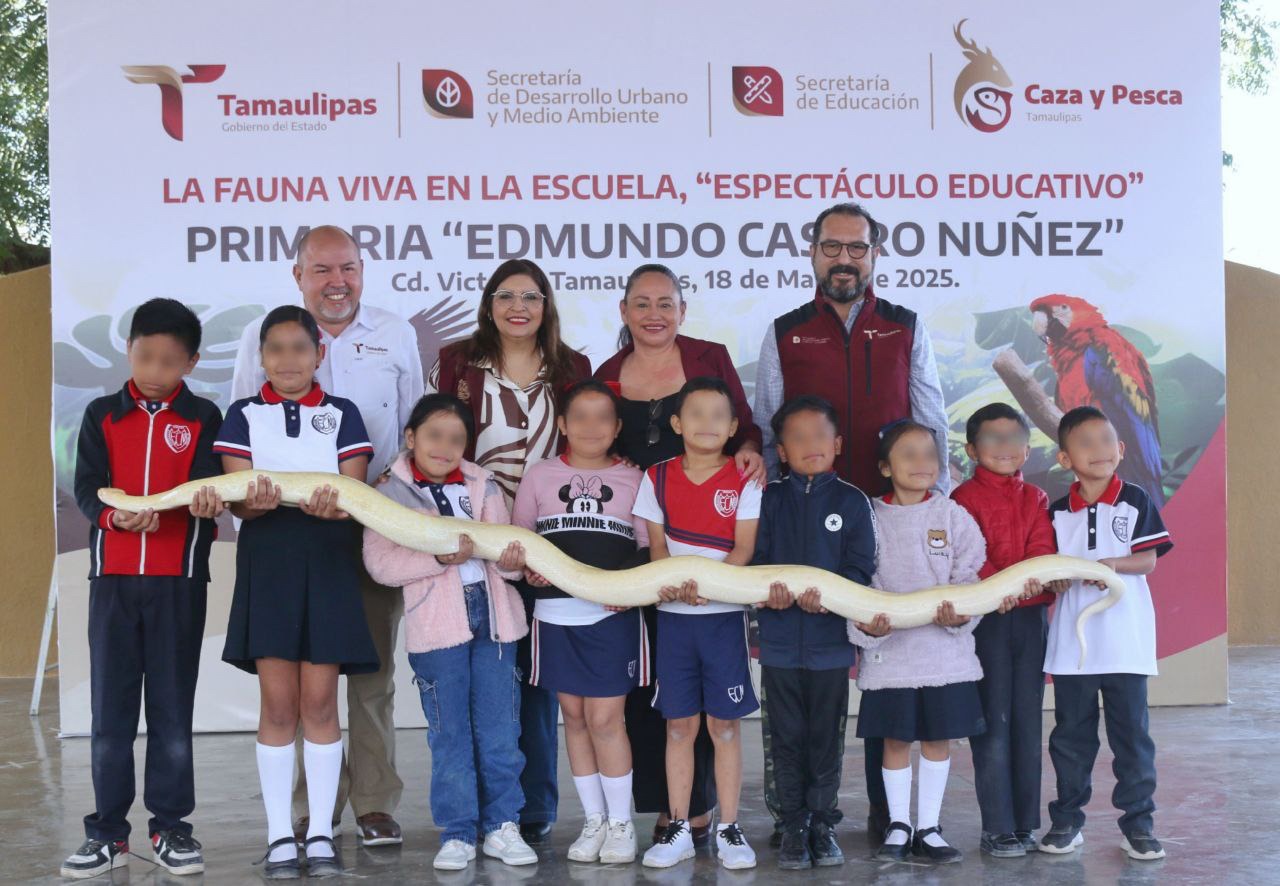 Ciudad Victoria, Tamaulipas.- Como parte de las acciones para fomentar el respeto y cuidado del entorno ecológico, la Secretaría de Desarrollo Urbano y Medio Ambiente (SEDUMA), a través de la Comisión de Caza y Pesca Deportiva, en coordinación con la Secretaría de Educación de Tamaulipas, continúa con el programa Fauna Viva en tu Escuela, Espectaculo Educativo”, y en esta ocasión, se visitó la primaria "Edmundo Castro Núñez" de la colonia Moderna en el municipio de Victoria.