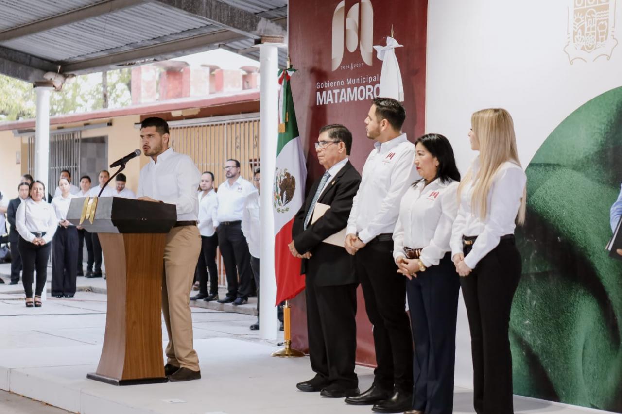 H. Matamoros, Tamaulipas.– En un acto presidido por el alcalde Beto Granados, autoridades municipales y la comunidad escolar se reunieron en la escuela primaria Celedonio Junco de la Vega para rendir honores a la bandera y recordar el legado de Rigo Tovar, reconocido cantante y compositor matamorense. La ceremonia marcó el inicio de una serie de actividades organizadas por el gobierno local en honor a su trayectoria musical.