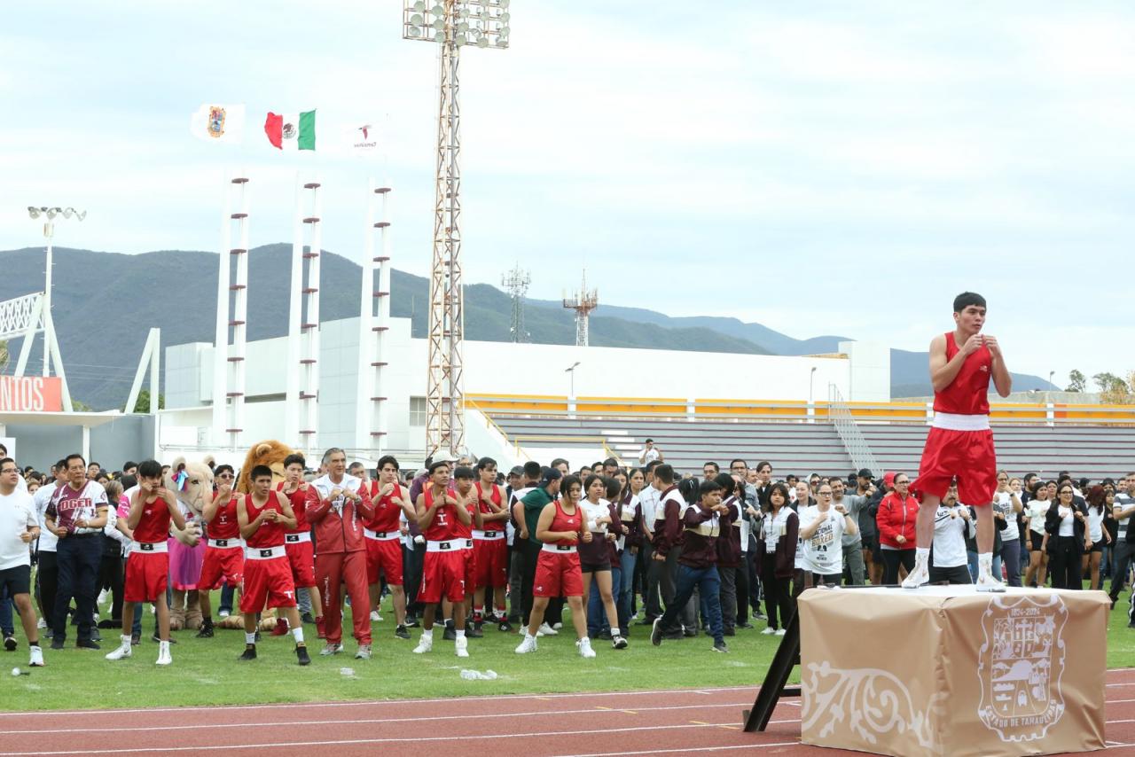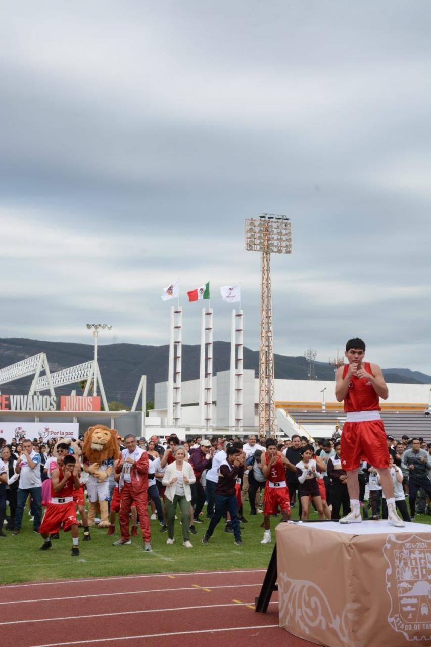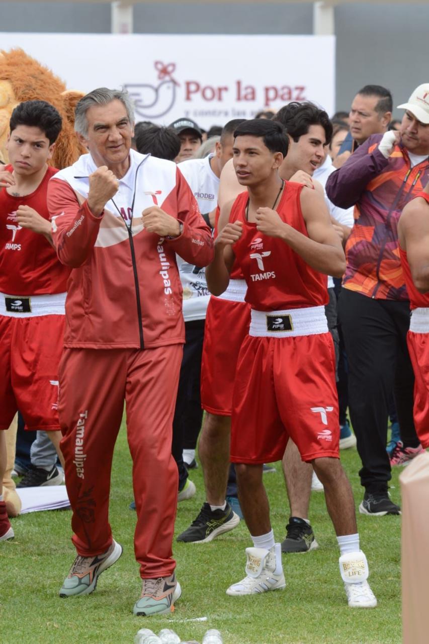 Acompañado por las y los integrantes de la selección tamaulipeca de boxeo, que recientemente brillaron en el Macro Regional de Tijuana, además de atletas, las y los secretarios e integrantes de su gabinete, y estudiantes, el mandatario tamaulipeco realizó todas las rutinas y se ejercitó al igual que las y los asistentes, siguiendo a las leyendas del boxeo que dieron cátedra desde el Zócalo de la Ciudad de México.