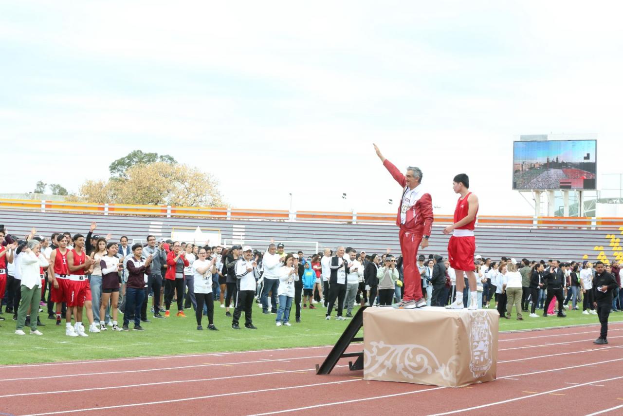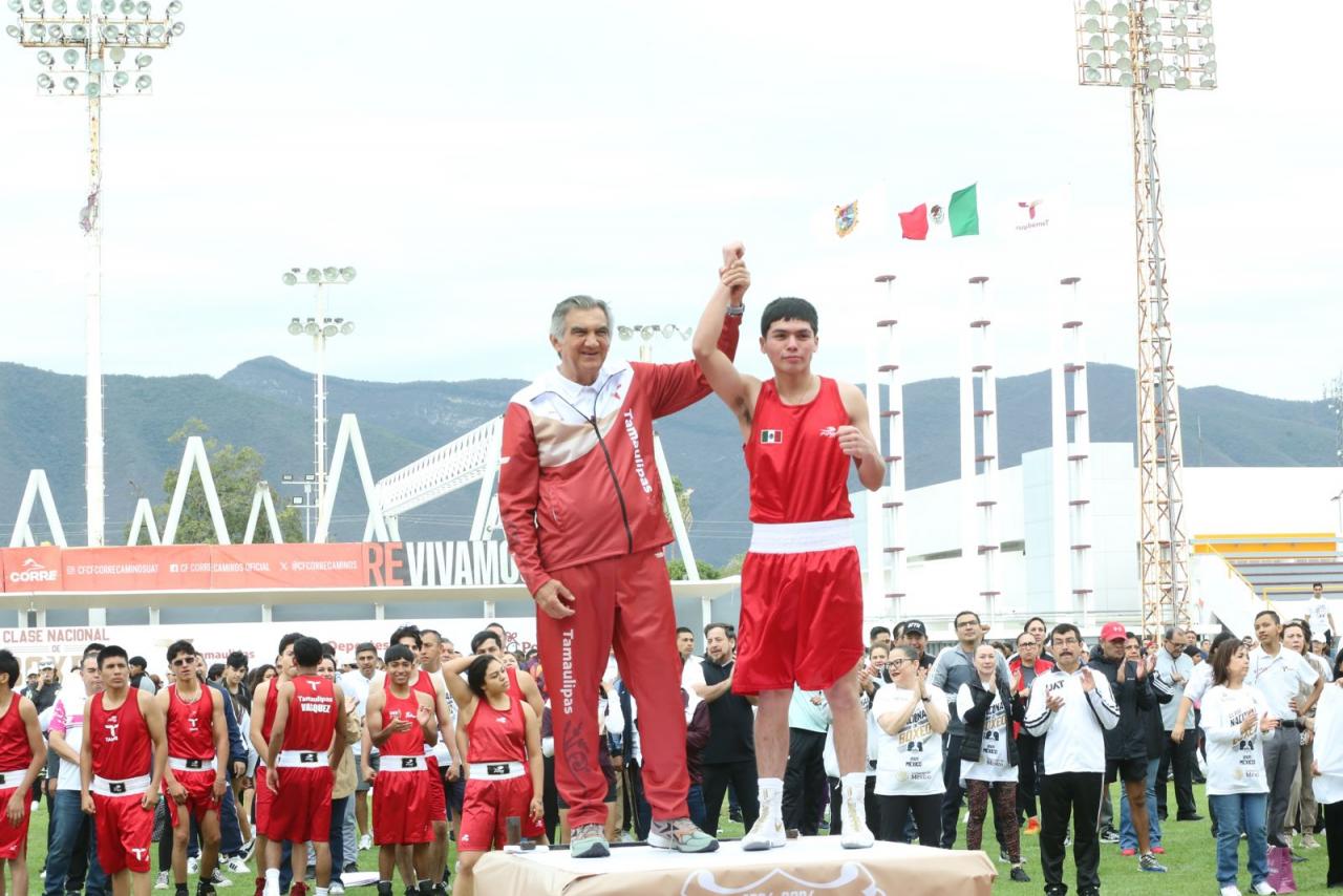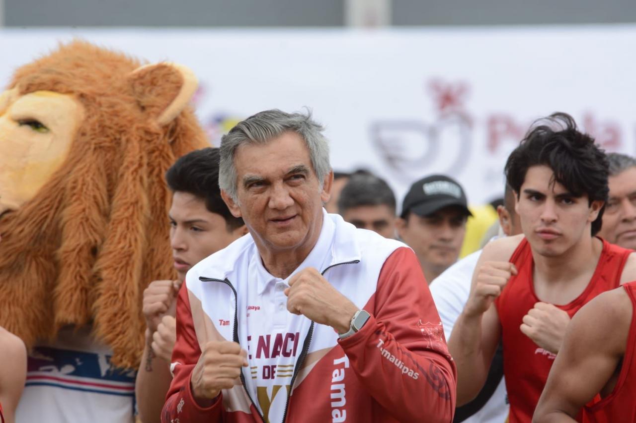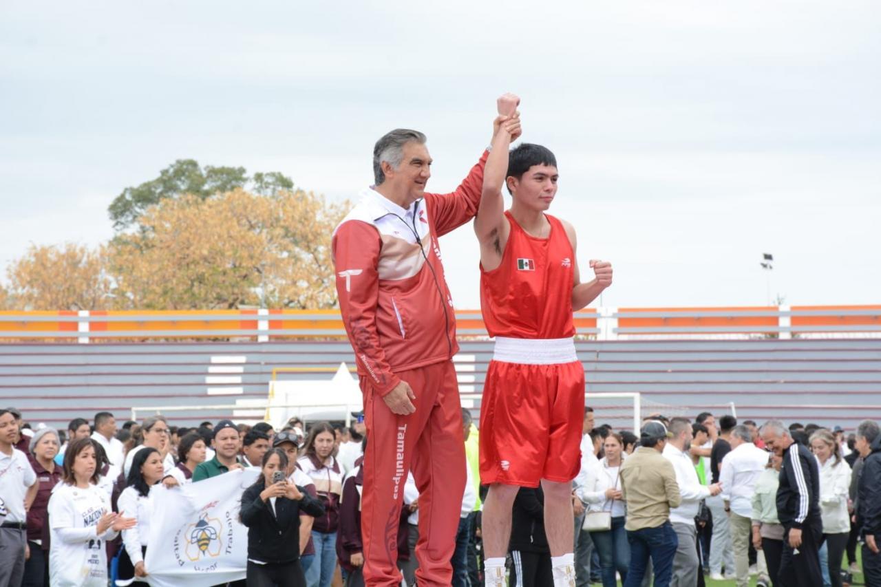 Acompañado por las y los integrantes de la selección tamaulipeca de boxeo, que recientemente brillaron en el Macro Regional de Tijuana, además de atletas, las y los secretarios e integrantes de su gabinete, y estudiantes, el mandatario tamaulipeco realizó todas las rutinas y se ejercitó al igual que las y los asistentes, siguiendo a las leyendas del boxeo que dieron cátedra desde el Zócalo de la Ciudad de México.