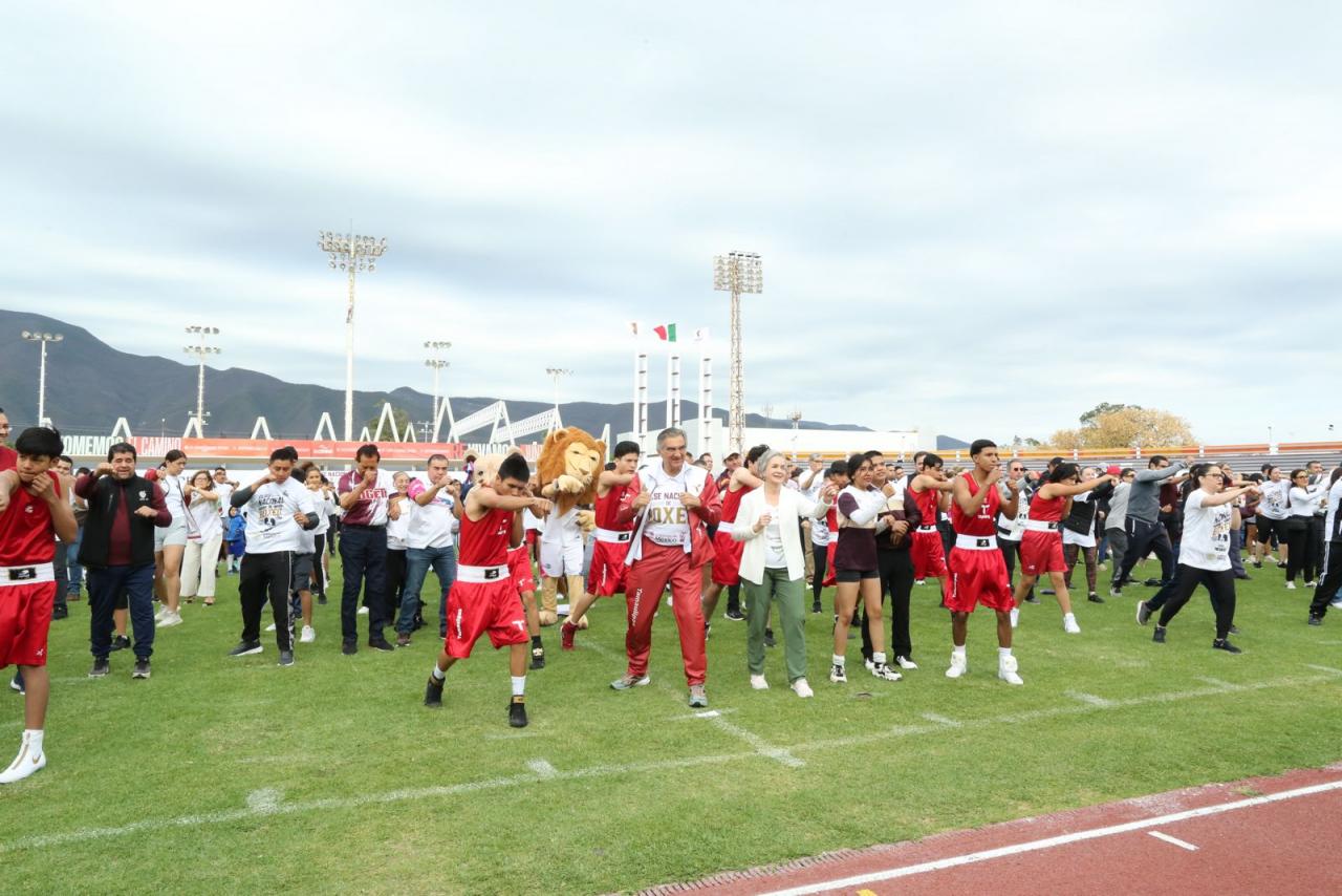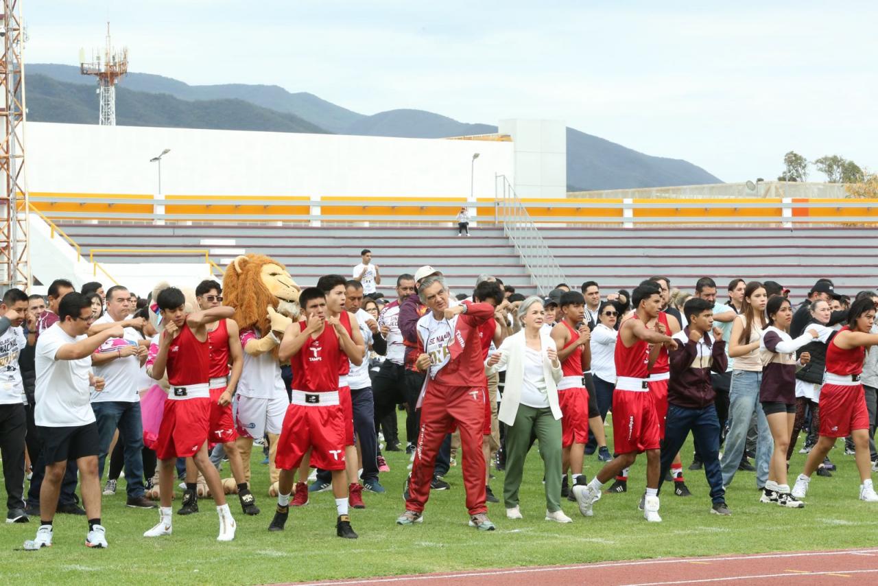 Ciudad Victoria, Tamaulipas. - Tamaulipas se sumó con éxito a la Clase Nacional de Boxeo "Por la paz y contra las adicciones”, con una participación multitudinaria encabezada por el gobernador Américo Villarreal Anaya y la presidenta del DIF Estatal, María de Villarreal, siguiendo en todo momento el evento presidido por la presidenta Claudia Sheinbaum, en el Zócalo de la Ciudad de México.