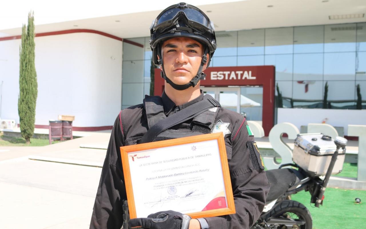 Ciudad Victoria, Tamaulipas. - Tras concluir su participación en el Curso Intensivo de Motopatrullaje, el policía A, Leonardo Maldonado Ramírez, expresó su reconocimiento y agradecimiento al gobernador de Tamaulipas, Américo Villarreal Anaya; y al secretario de Seguridad Pública del Estado, Sergio Hernando Chávez García, por brindarles la oportunidad de fortalecer sus habilidades operativas.