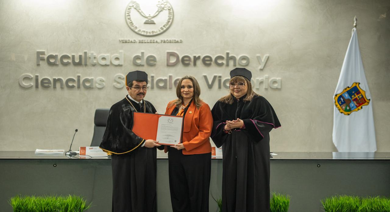 En el marco de la Asamblea Solemne de la Universidad Autónoma de Tamaulipas, el rector Dámaso Anaya Alvarado entregó el nombramiento como presidenta honoraria de Familia UAT, a la Lic. Isolda Rendón Monterrey, destacando su liderazgo en iniciativas que fortalecen la unidad y el bienestar de la comunidad universitaria.