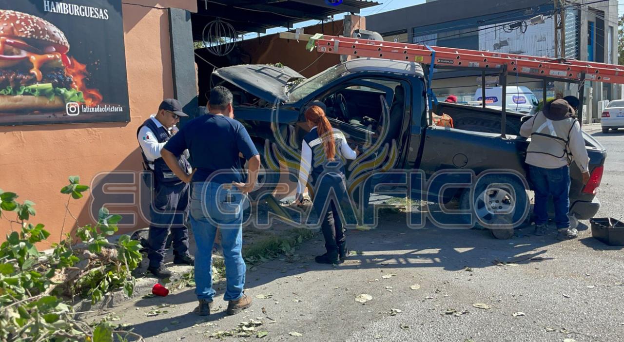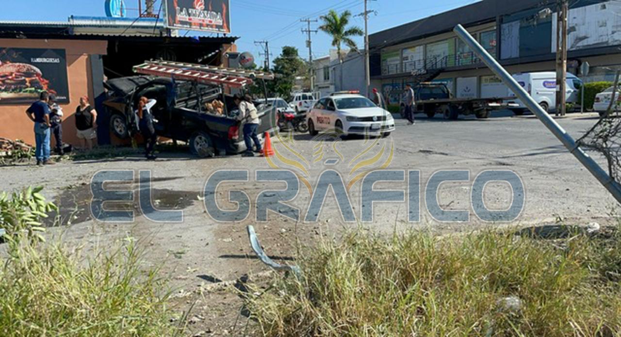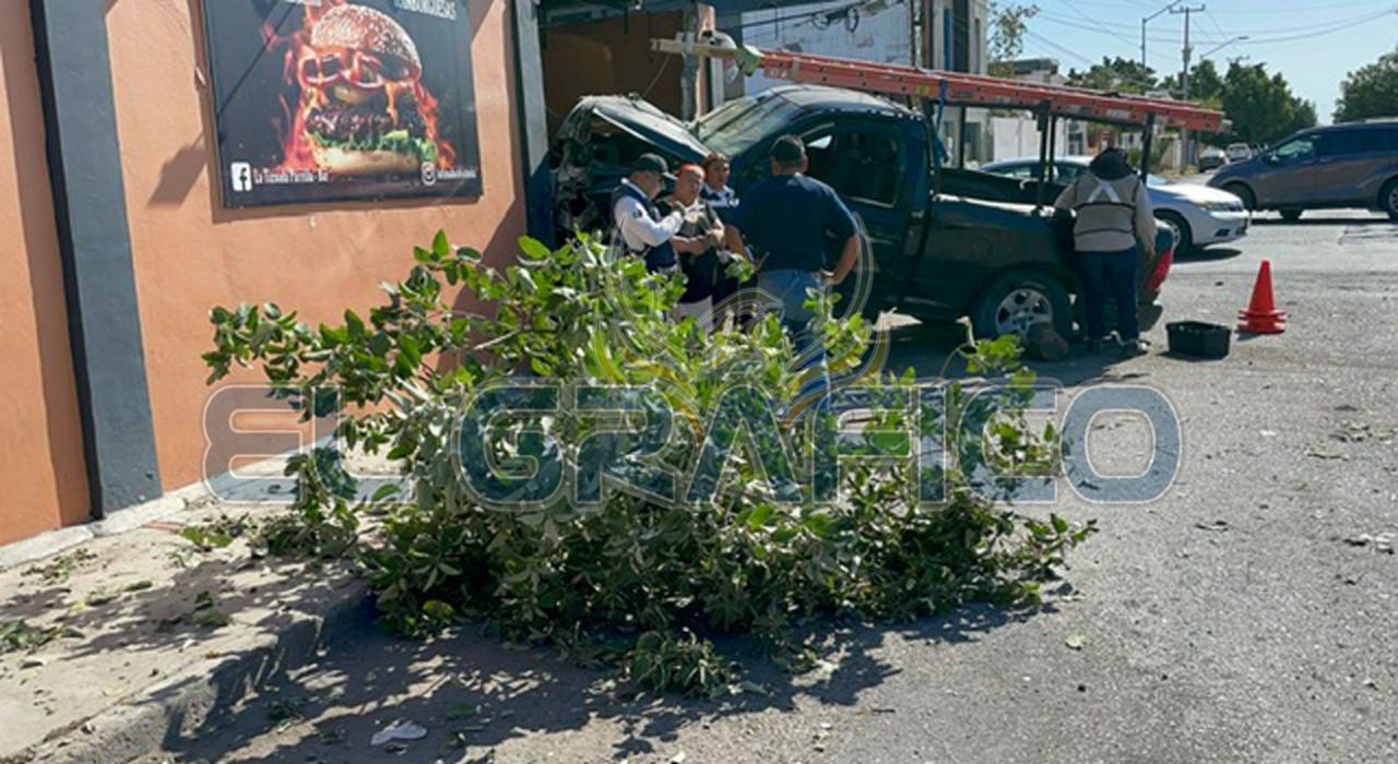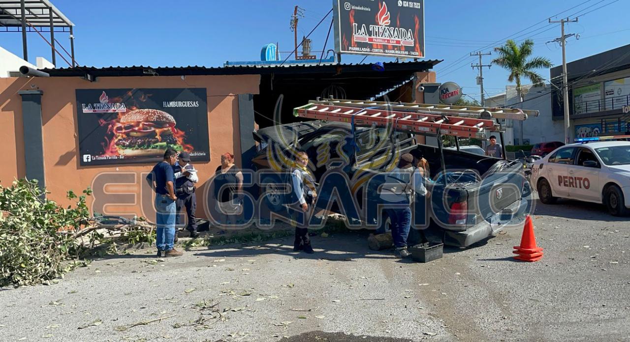 Finalmente, la camioneta cruzó la calle Marte R Gómez del Fraccionamiento Del Valle, tumbó un árbol de medianas dimensiones y terminó su carrera sin control, incrustándose contra la pared de un restaurante de carnes asadas y parrilladas.