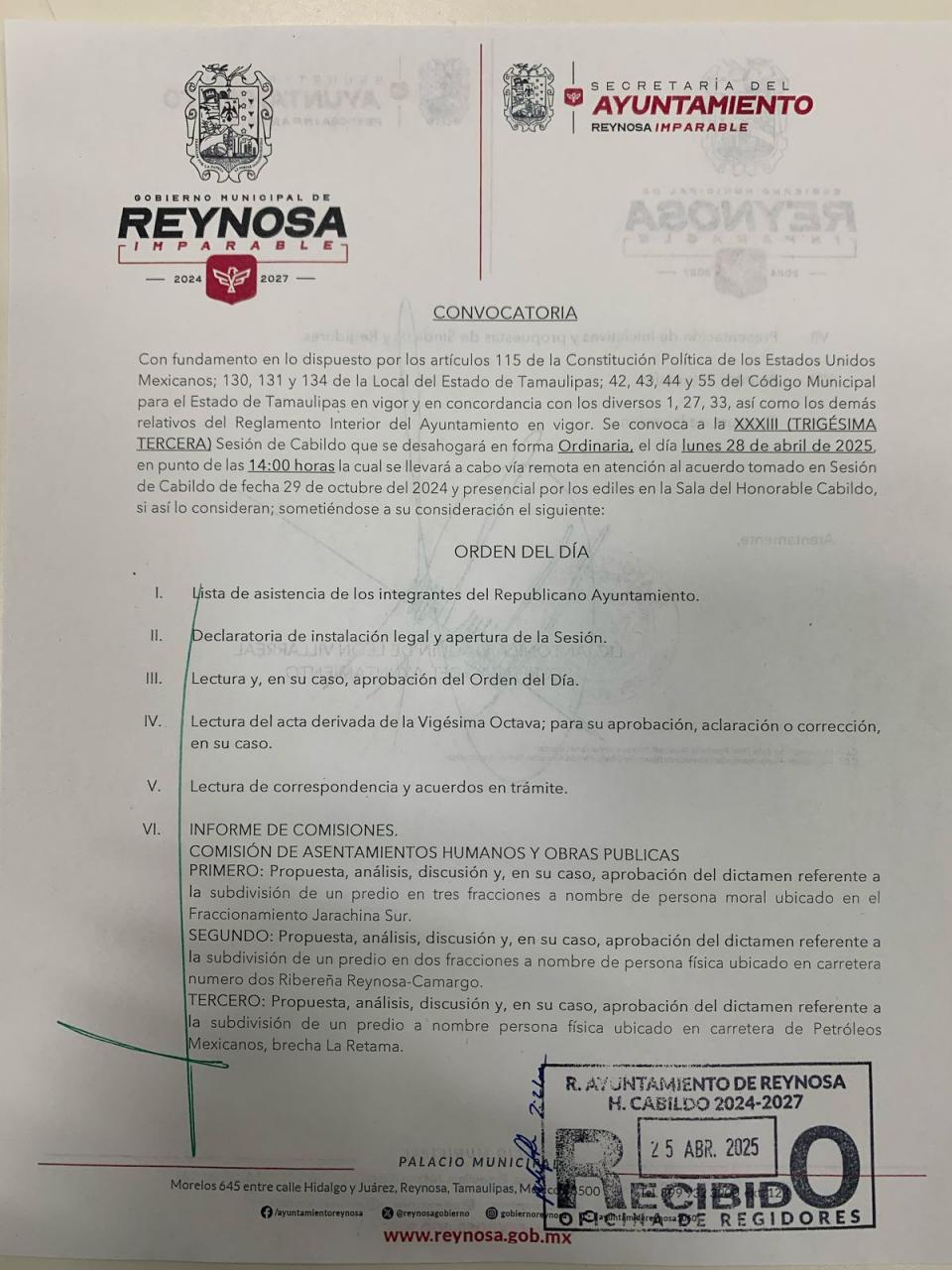 La Convocatoria para la XXXIII Sesión de Cabildo en Reynosa prevista a las 14 horas (2 de la tarde) del lunes 28 de abril, fue especificada como ORDINARIA, en consecuencia, no había inconveniente de celebrarla en forma pública y difundir su transmisión a través de los medios de comunicación oficiales y redes sociales disponibles.