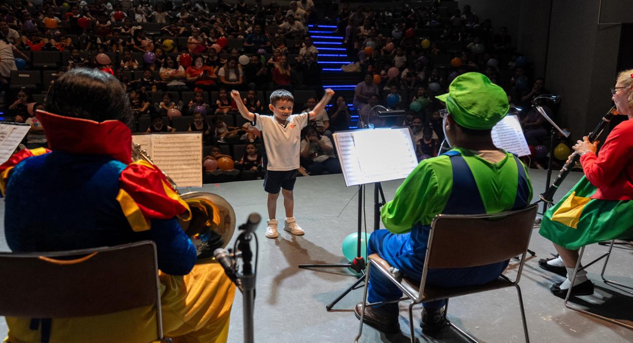 Además, los integrantes del quinteto aprovecharon la ocasión para enseñar a los pequeños los instrumentos que conforman un ensamble de alientos: el fagot, la flauta transversal, el corno francés y el clarinete, fomentando así su curiosidad por la música.
