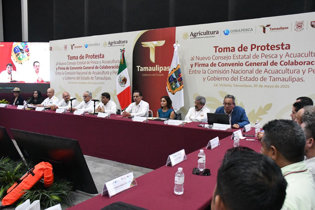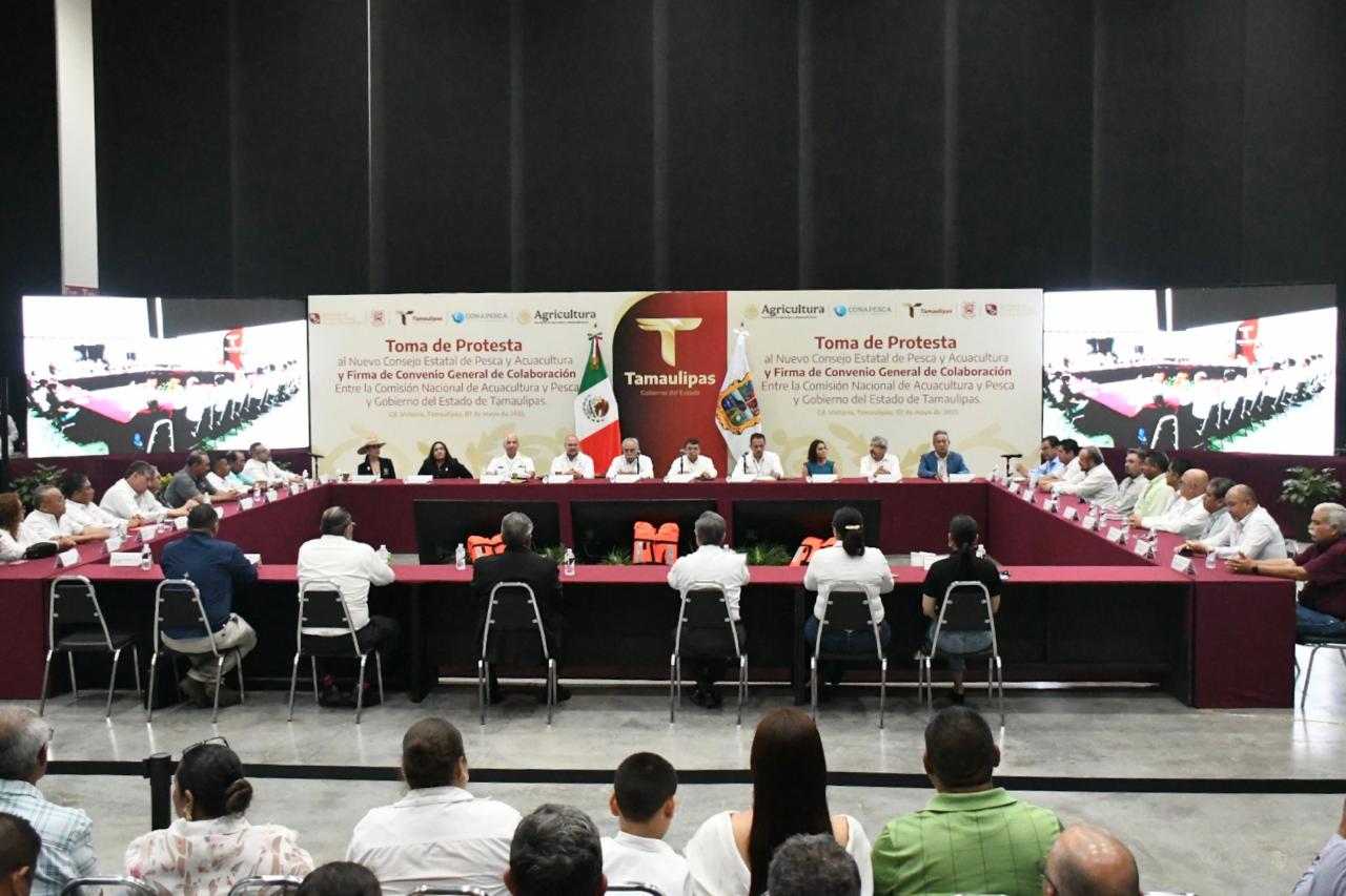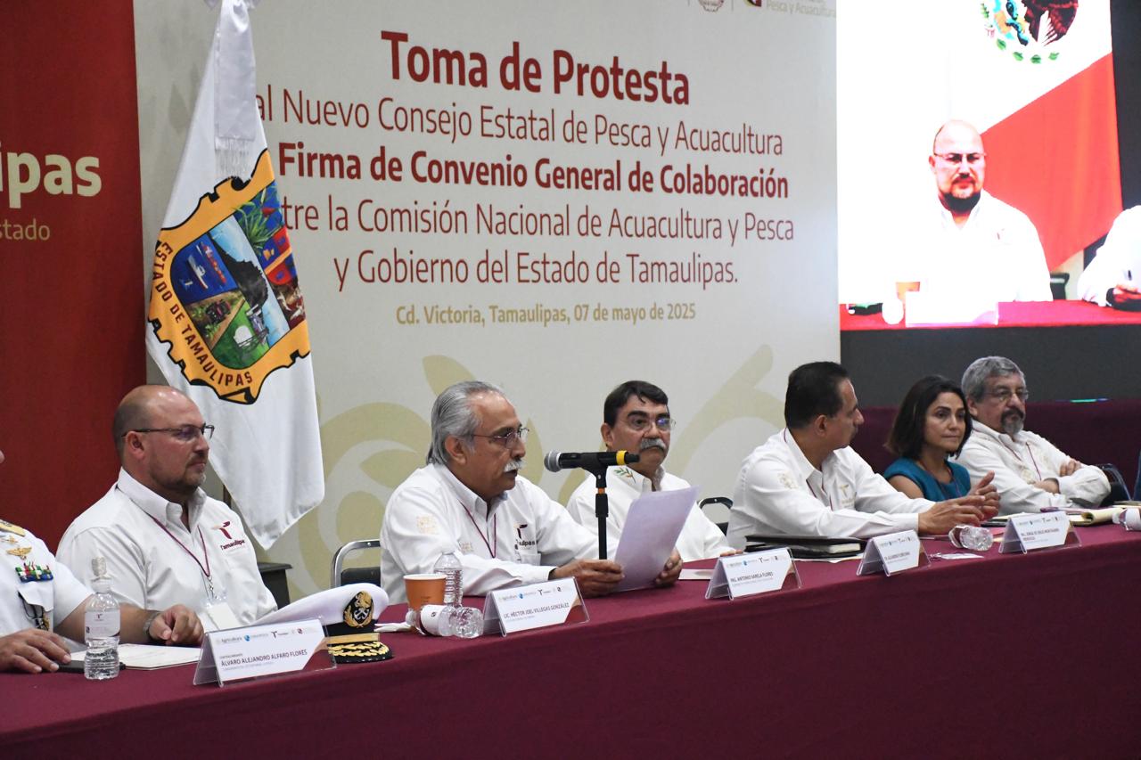 Ciudad Victoria, Tamaulipas.- Con el objetivo de promover la coordinación y colaboración entre los tres niveles de gobierno, así como con los organismos productivos del sector social y privado, se realizó la instalación del Consejo Estatal de Pesca y Acuacultura, acompañada de la firma del Convenio General de Colaboración entre la Comisión Nacional de Acuacultura y Pesca y el Gobierno de Tamaulipas.
