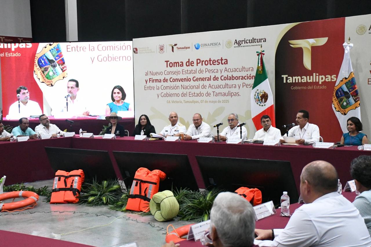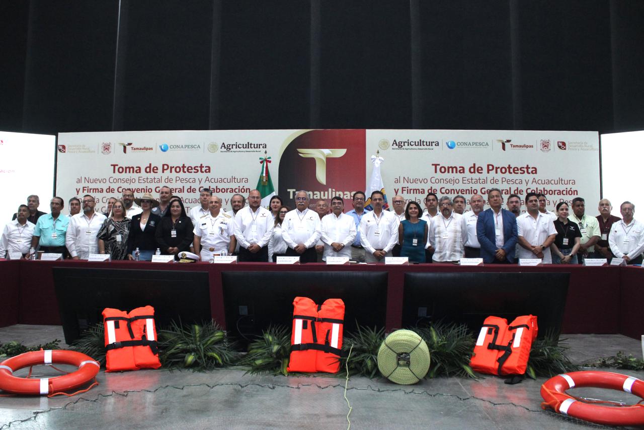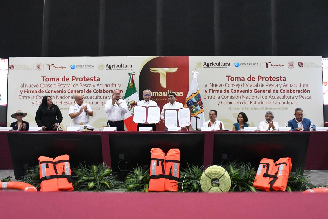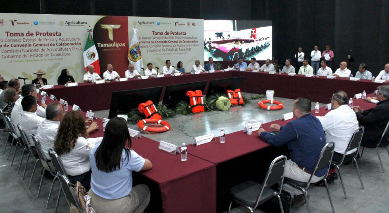 Ciudad Victoria, Tamaulipas.- Con el objetivo de promover la coordinación y colaboración entre los tres niveles de gobierno, así como con los organismos productivos del sector social y privado, se realizó la instalación del Consejo Estatal de Pesca y Acuacultura, acompañada de la firma del Convenio General de Colaboración entre la Comisión Nacional de Acuacultura y Pesca y el Gobierno de Tamaulipas.