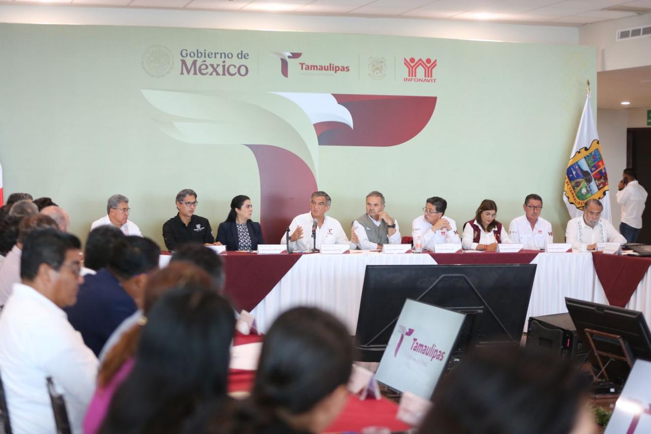 Tampico, Tamaulipas. - El gobernador Américo Villarreal Anaya y el director general del INFONAVIT, Octavio Romero Oropeza, reiteraron el compromiso de sumar esfuerzos y trabajar de manera coordinada para cumplir la meta del Programa de Vivienda para el Bienestar de 43 mil casas nuevas en Tamaulipas, para las y los trabajadores de menores ingresos.