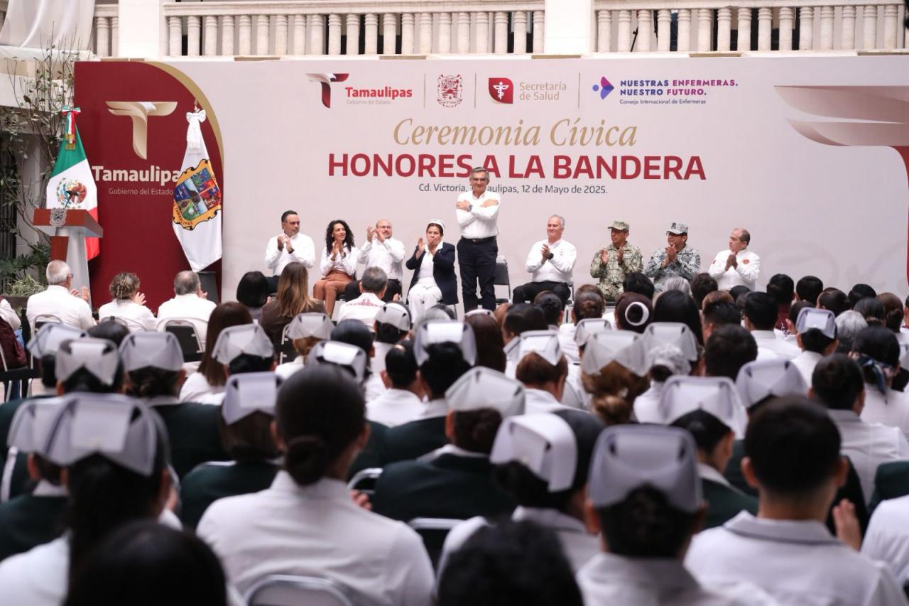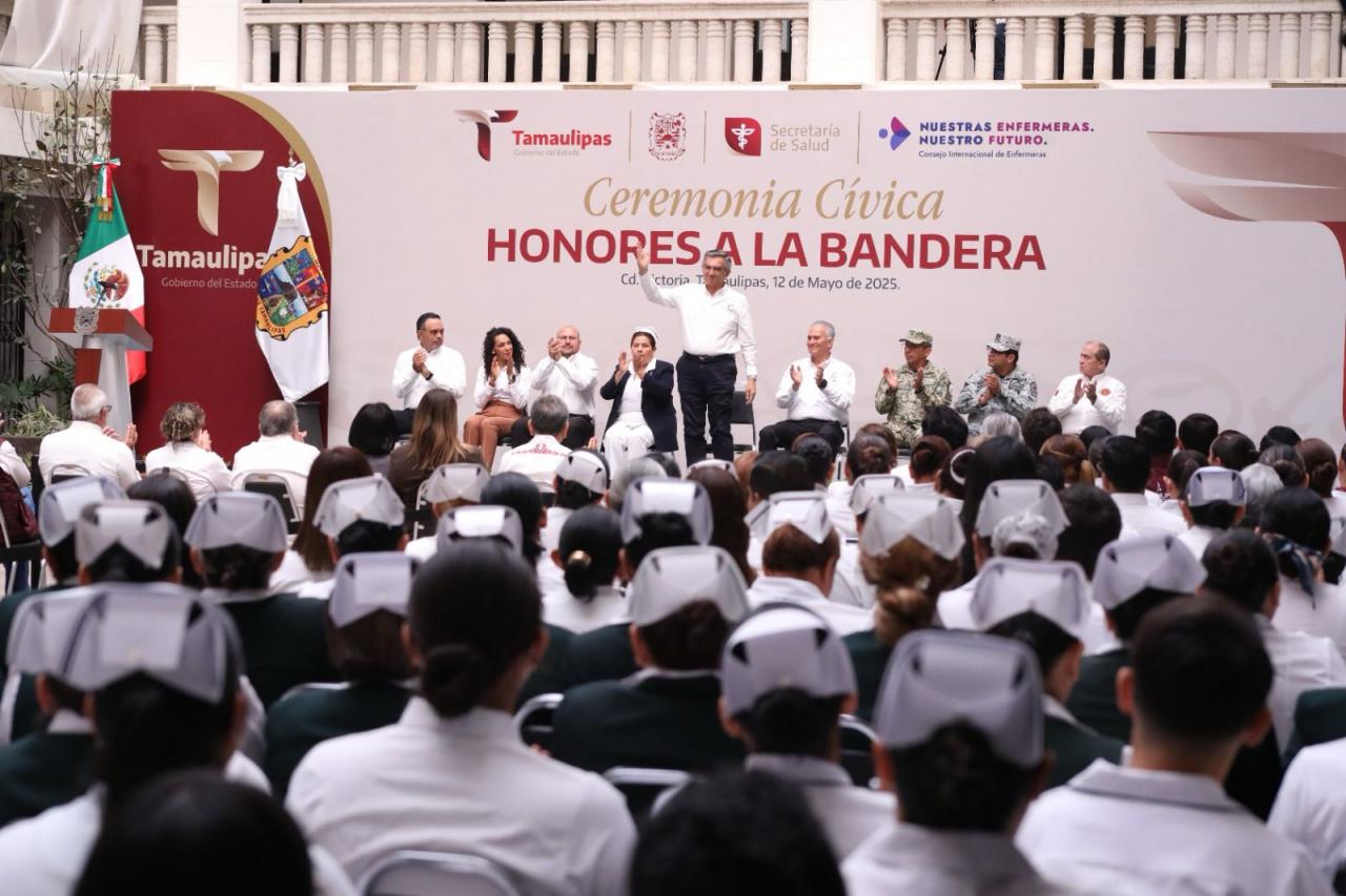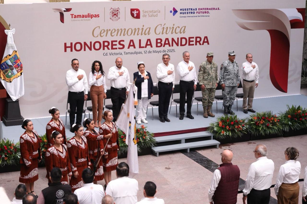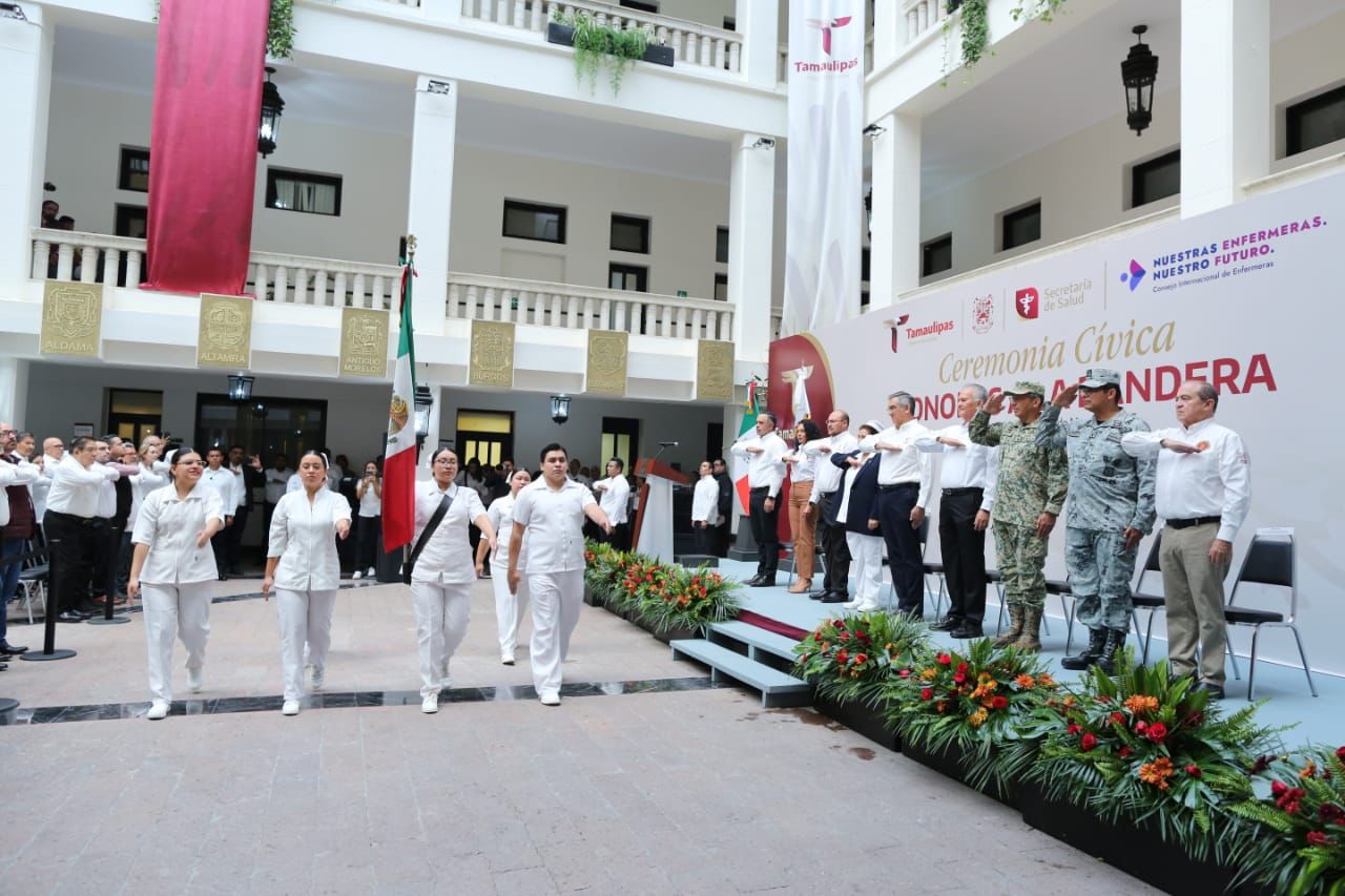 También acompañaron al gobernador en esta ceremonia cívica: Héctor Joel Villegas González, secretario general de Gobierno; diputada Cynthia Jaime Castillo, presidenta de la Mesa Directiva del Congreso; diputado Víctor Manuel García Fuentes, presidente de la Comisión de Salud; magistrado Hernán de la Garza Tamez, presidente del Supremo Tribunal de Justicia; general Enrique García Jaramillo, comandante de la 48 Zona Militar, y el general Francisco Alvarado Terán, coordinador de la Guardia Nacional en Tamaulipas, además de funcionarios del gabinete estatal y personal de enfermería de diferentes unidades médicas.