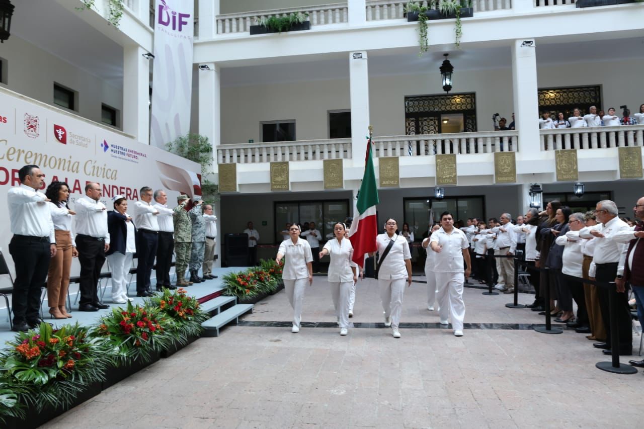 Al conmemorar el Día Internacional de la Enfermería, en el marco de la ceremonia cívica de honores, este lunes en el patio central de Palacio de Gobierno, el gobernador reiteró su reconocimiento y felicitación a las y los compañeros de esta noble profesión de la enfermería, una de las más humanistas, dijo, y aseguró que la enfermera es ahora una profesional de la salud.