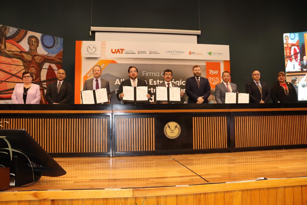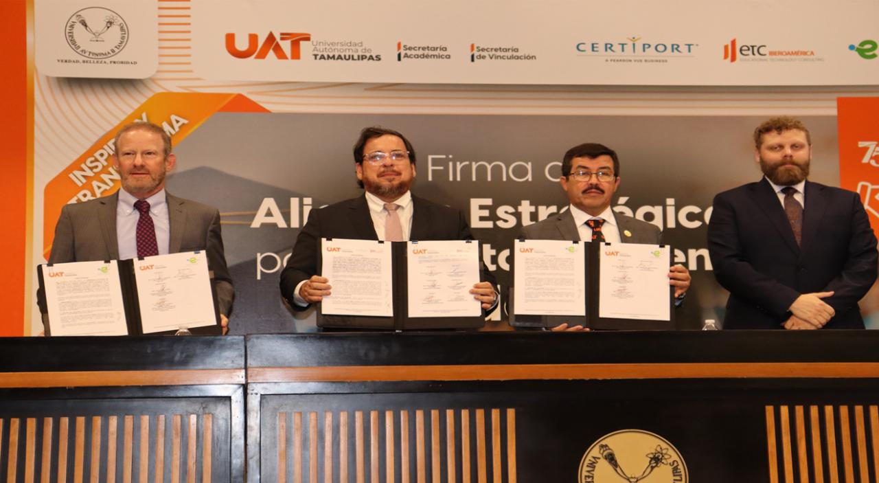 Con el propósito de fortalecer los procesos formativos y elevar la competitividad académica, el rector de la Universidad Autónoma de Tamaulipas (UAT), Dámaso Anaya Alvarado, presidió la firma de alianzas estratégicas con organismos internacionales especializados en certificación y desarrollo académico.
