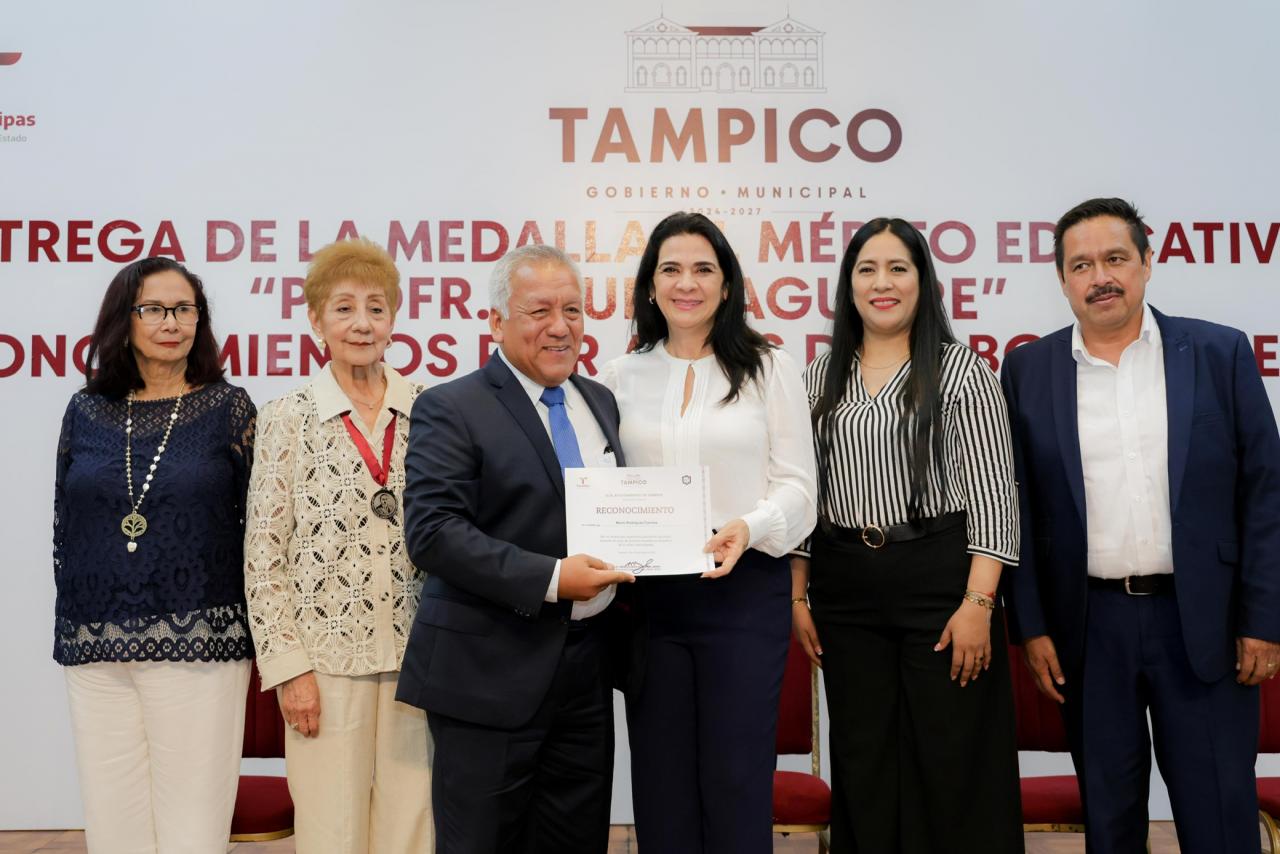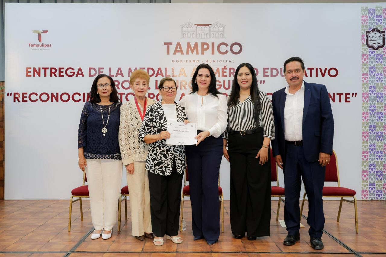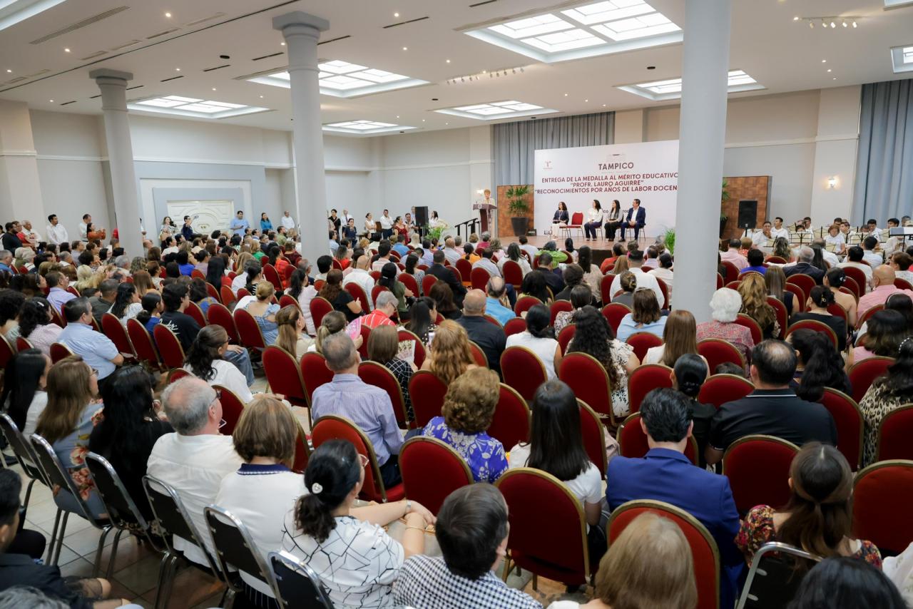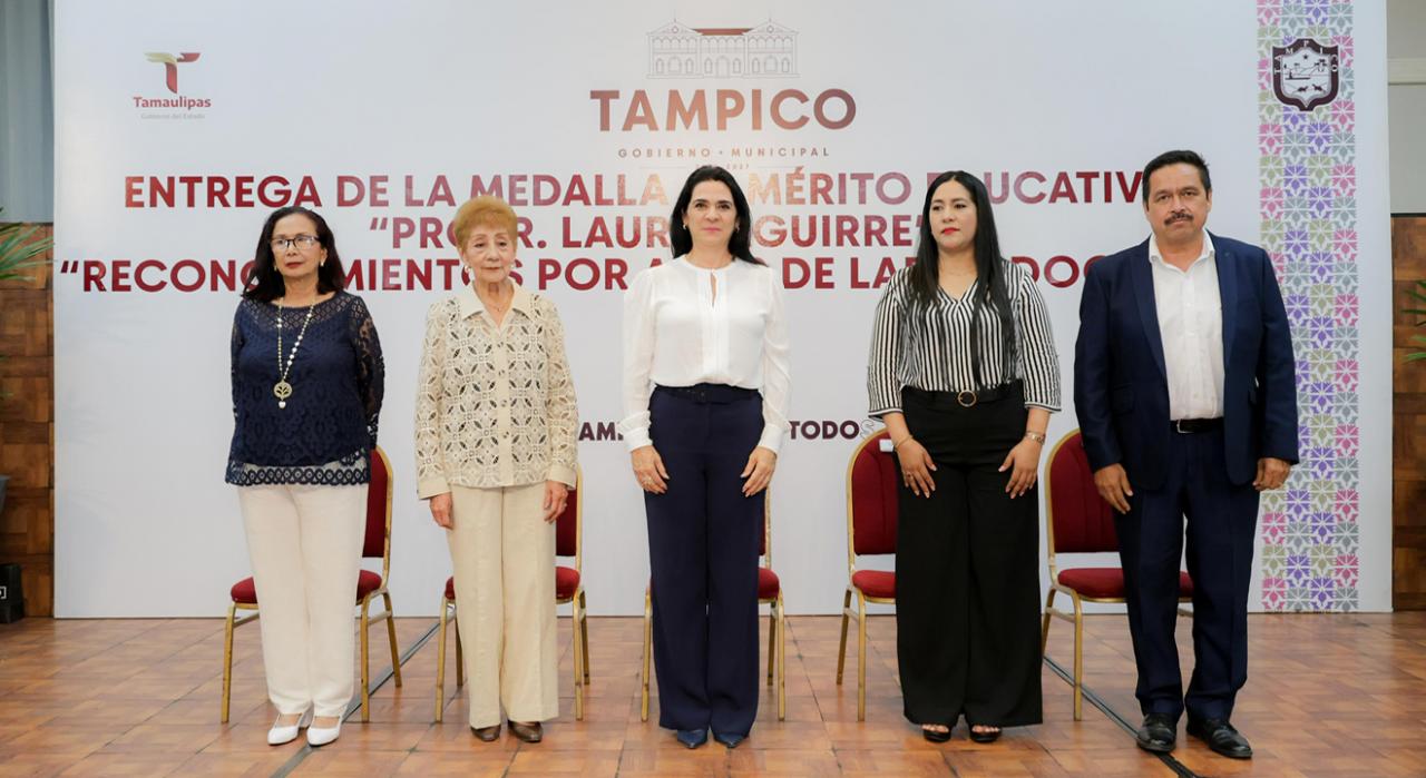 La Presidenta Municipal de Tampico Mónica Villarreal Anaya, encabezó la ceremonia de entrega de la medalla al mérito educativo "Lauro Aguirre" y reconocimientos a la labor magisterial con 25, 30, 40, 50 y 60 años de servicio docente.