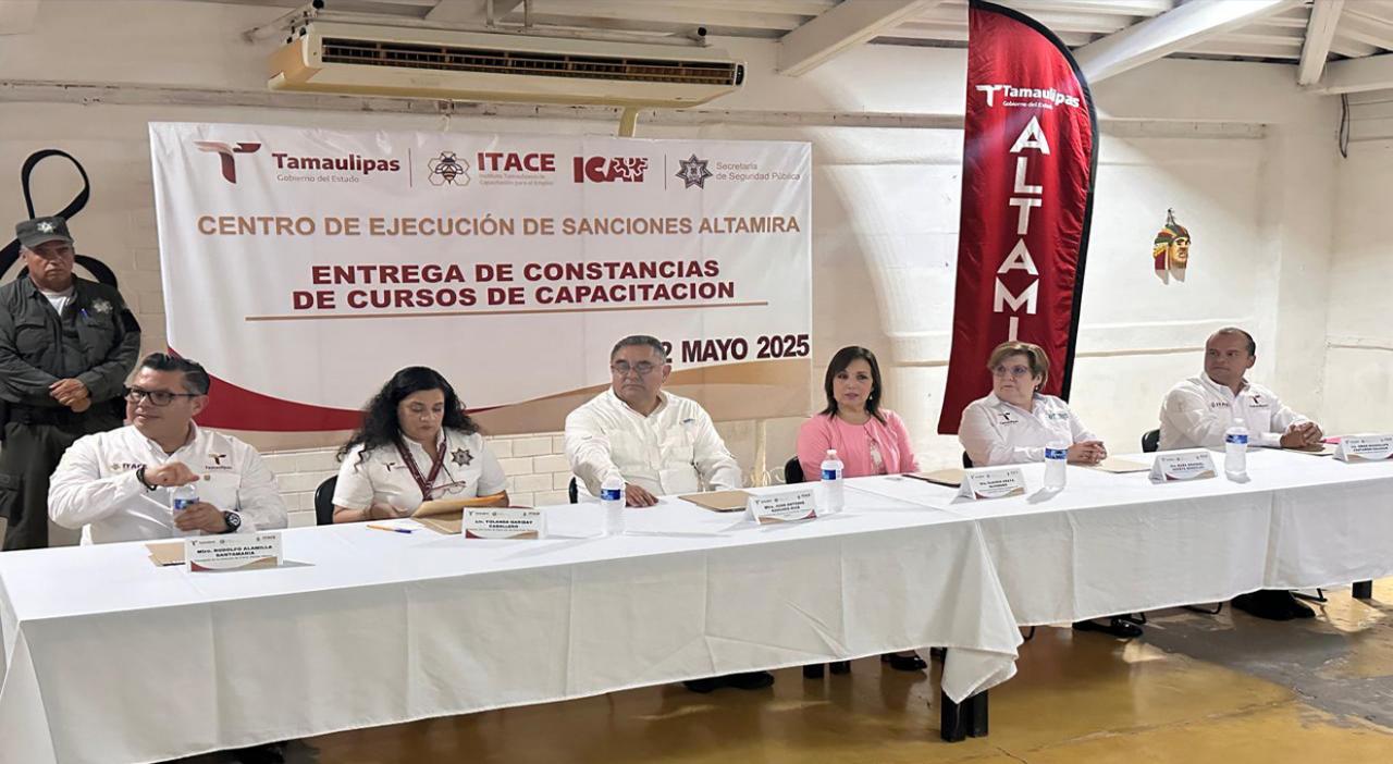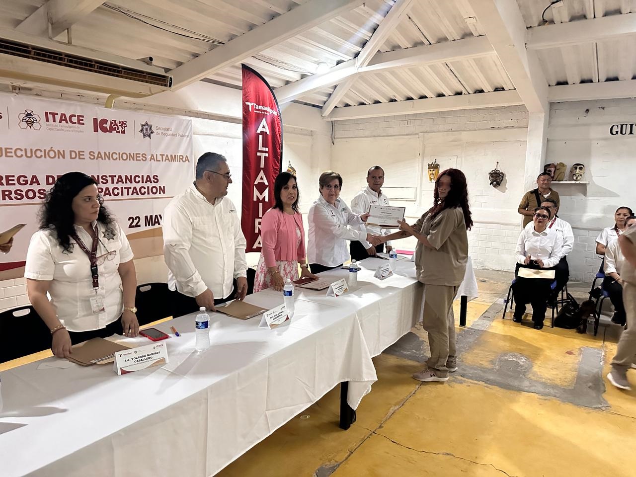 La ceremonia de entrega de constancias contó con la presencia de la directora general del ITACE, Claudia Anaya Alvarado; el subsecretario de Ejecución de Sanciones y Reinserción Social, Juan Antonio Sánchez Ruiz; la rectora de la Universidad Tecnológica de Altamira, Mara Grassiel Acosta González; la directora del CEDES Altamira, Yolanda Garibay Caballero; y Omar Guadalupe Castañón Salazar, subdirector general del Sistema ITACE.