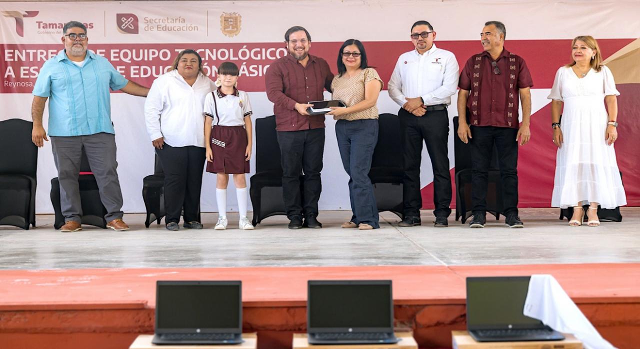 Reynosa, Tamaulipas.– Con el objetivo de que las y los estudiantes cuenten con mejores herramientas y condiciones óptimas para su desarrollo educativo, la Secretaría de Educación de Tamaulipas (SET) entregó equipo tecnológico a escuelas primarias y secundarias del municipio de Reynosa.