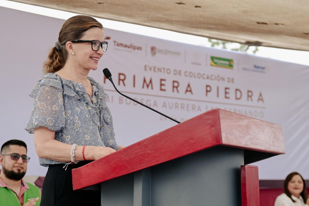 San Fernando, Tamaulipas.– Como resultado del entorno de confianza para la inversión comercial en Tamaulipas, la secretaria de Economía, Ninfa Cantú Deándar junto con la presidenta municipal de San Fernando, Veronica Aguirre y Rodrigo Flores Amezcua, director de Relaciones Institucionales de Walmart de México encabezaron la ceremonia de colocación de la primera piedra para la construcción de la tienda Mi Bodega Aurrerá que representa una inversión de 50 millones de pesos.