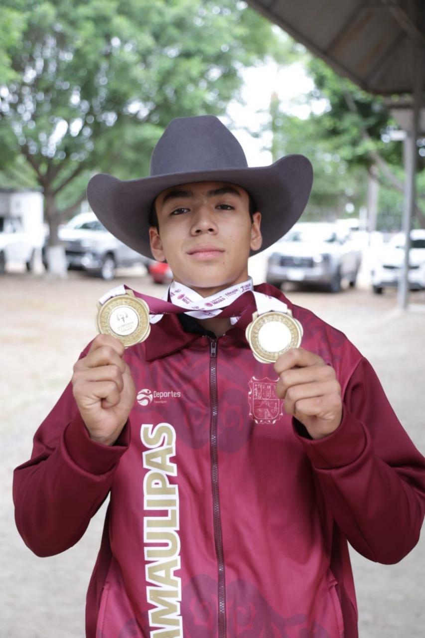 El director general del Instituto del Deporte de Tamaulipas, Manuel Virués Lozano, confirmó que el victorense Alejandro Anaya Hernández se colgó dos medallas de oro al dominar las pruebas de amarre de chiva y lazo de becerro, ambas en la categoría juvenil.