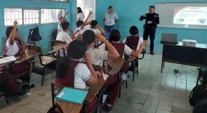 Nuevo Laredo, Tamaulipas.- En el marco de la Séptima Jornada Cultural de Prevención y Auxilio, personal de la Guardia Estatal de Género acudió a la Escuela Secundaria Técnica Número 78 México Dos Mil ubicada en el municipio de Nuevo Laredo para impartir un taller preventivo de acoso cibernético.