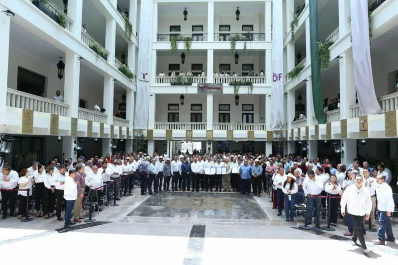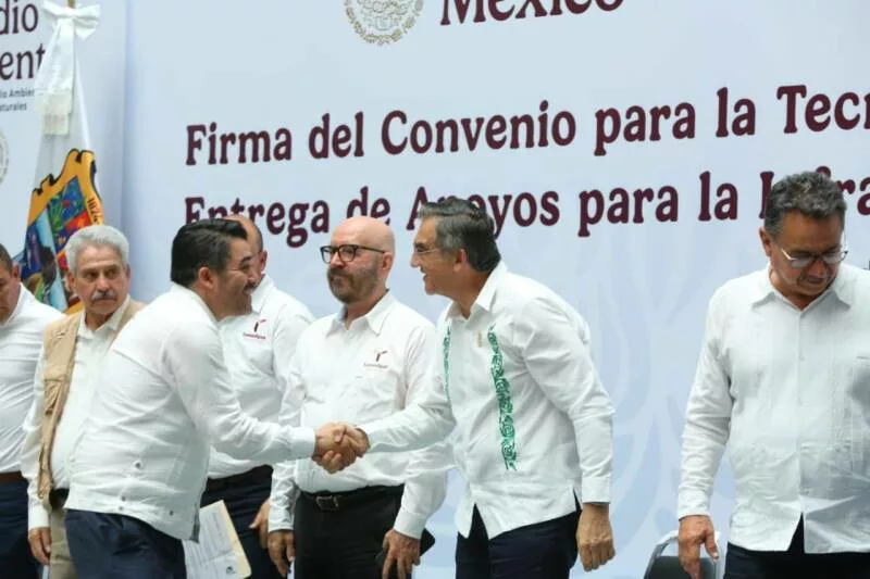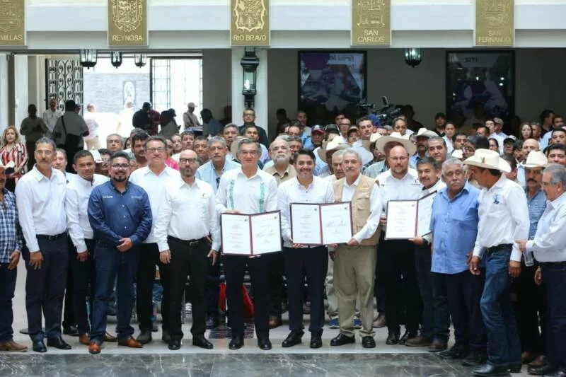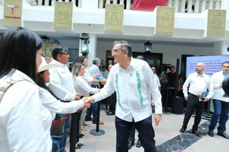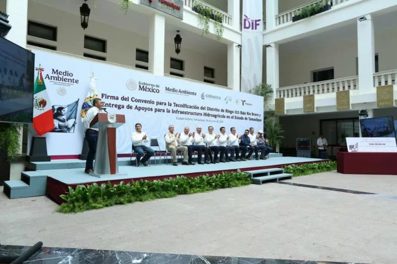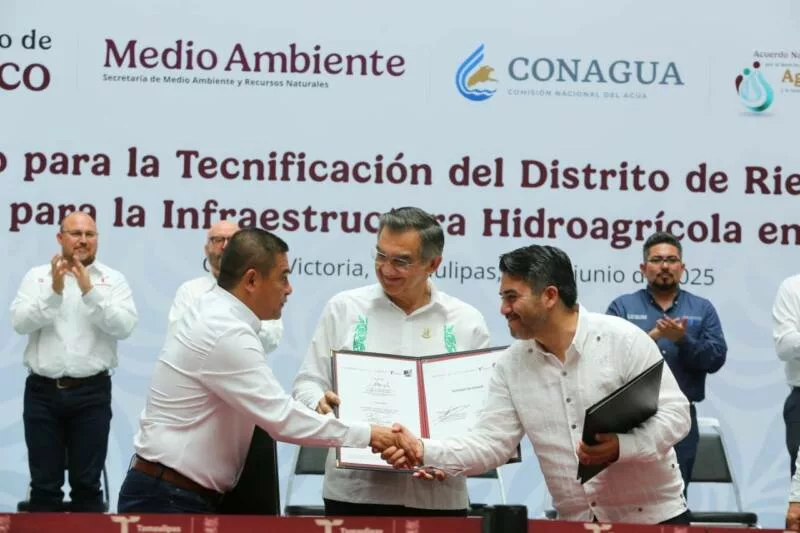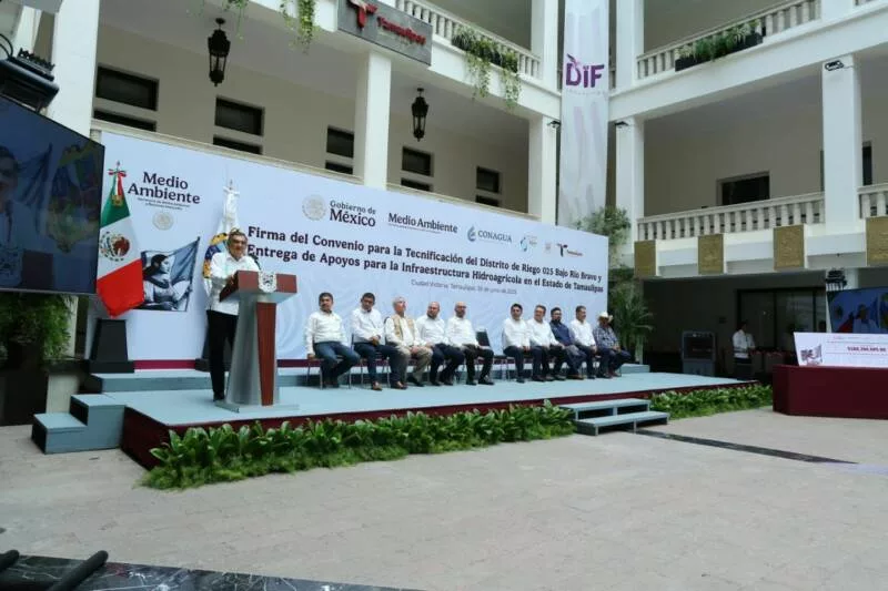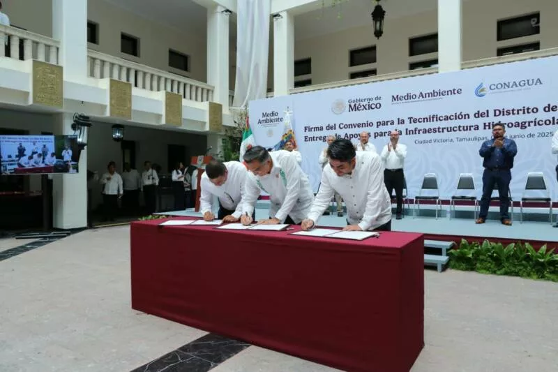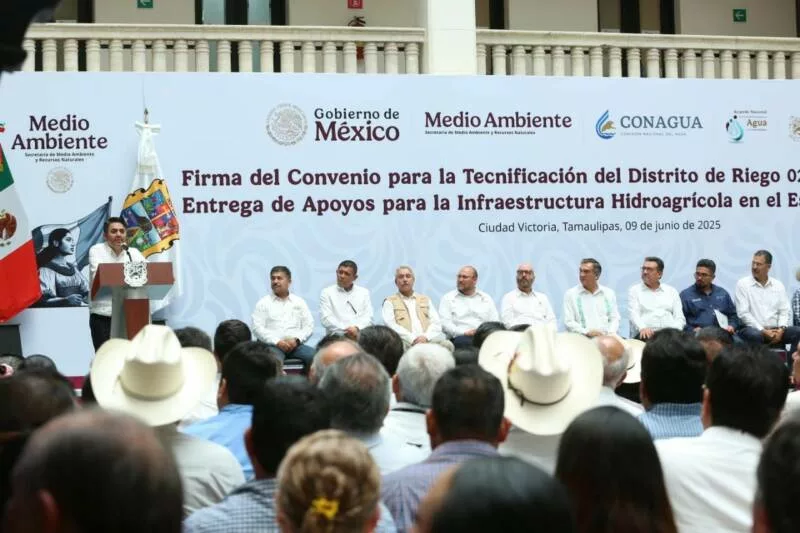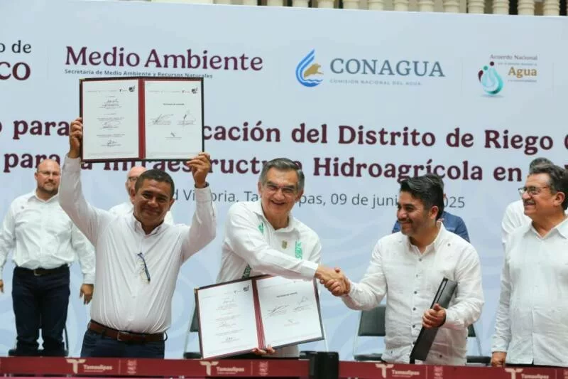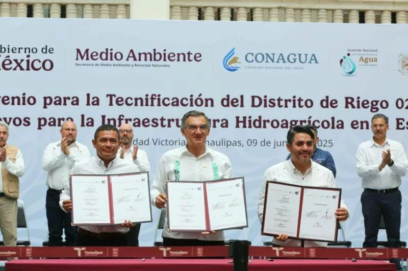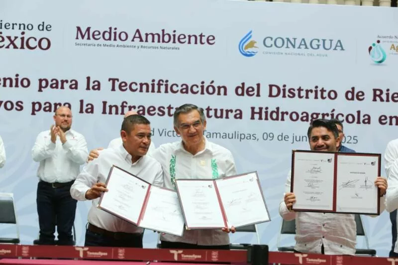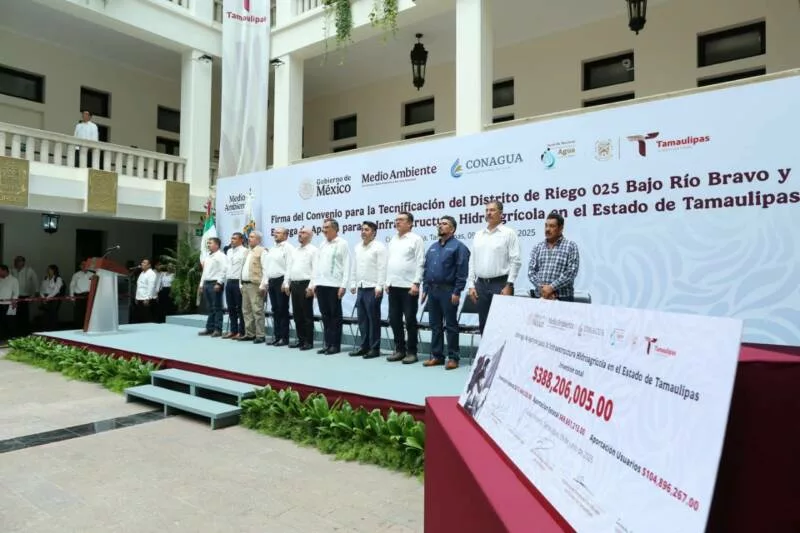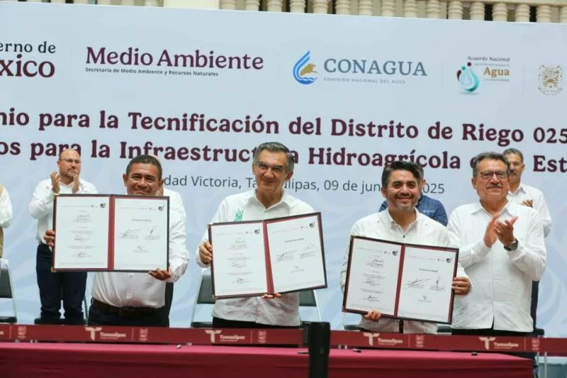 Ciudad Victoria, Tamaulipas.- En un hecho histórico y trascendental para la modernización del campo tamaulipeco, y en cumplimiento de uno de los 100 compromisos establecidos por la presidenta de México, Claudia Sheinbaum Pardo, orientado a tecnificar más de 200,000 hectáreas para riego agrícola, este lunes se firmó el Convenio para la Tecnificación del Distrito de Riego 025 Bajo Río Bravo, por el director general de la Comisión Nacional del Agua (Conagua), Efraín Morales López, y el gobernador de Tamaulipas, Américo Villarreal Anaya. Además, se llevó a cabo la Entrega de Apoyos para la Infraestructura Hidroagrícola en el estado con un monto de 388 millones 206 mil pesos.