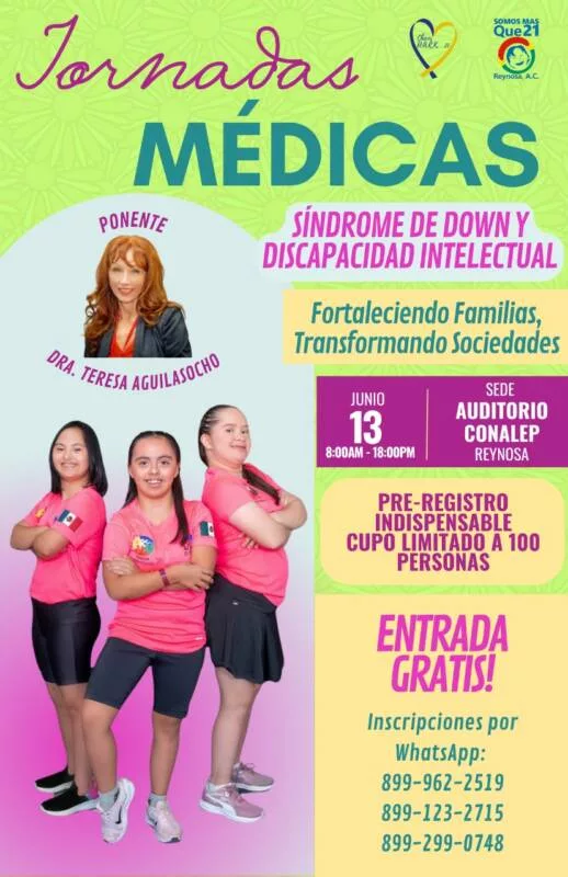 Reynosa será sede de las Jornadas Medicas para pacientes de Síndrome de Down y Discapacidad Intelectual, contando con una amplia actividad, teniendo la ponencia magistral de la doctora Teresa Aguilasocho, presidenta de la Federacion Nacional de Down en Nuevo León, especialista en psicología perinatal y estimulación.