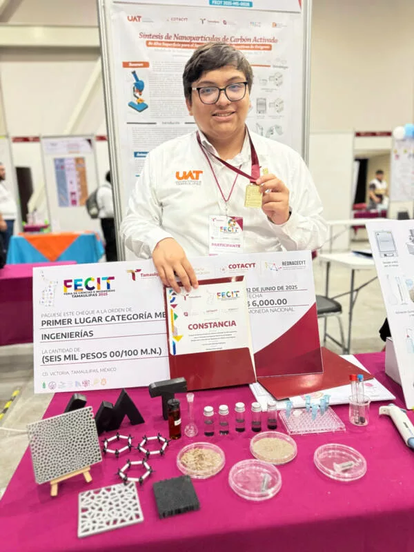 El proyecto de Luis Fernando, titulado “Síntesis de nanopartículas de carbono activado de alta superficie para el secuestro de especies reactivas de oxígeno: Modelo de la inducción de apoptosis en células cancerígenas”, obtuvo el primer lugar en la categoría de nivel medio superior en la Feria de Ciencias e Ingenierías Tamaulipas (FECIT 2025).