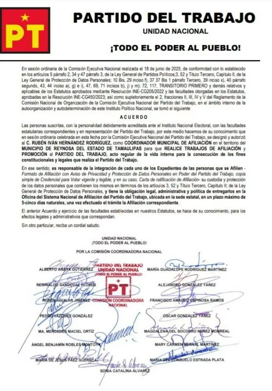 En Sesión Ordinaria de la Comision Ejecutiva Nacional del Partido del Trabajo, efectuada en la Ciudad de Mexico y presidida por el Senador Alberto Anaya Gutierrez, asi como el pleno del Comité Nacional. Rubén Ivan Hernández Rodríguez, fue designado como Coordinador Municipal de Afiliación en Reynosa Tamaulipas.
