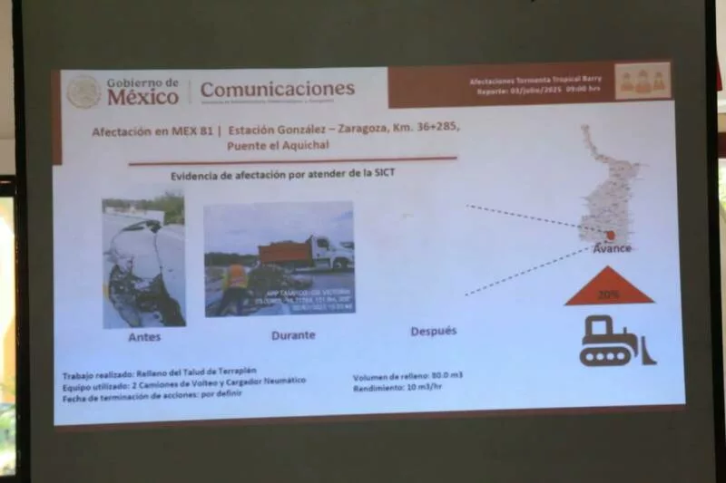 Asimismo, el director general del Centro Tamaulipas de la Secretaría de Infraestructura, Comunicaciones y Transportes, Mario Mata Resendiz, expuso las afectaciones que sufrió la red carretera y ferroviaria en el estado por las lluvias de la tormenta Barry y aseguró que ya se realizaron las valoraciones técnicas y se ha comenzado con tareas de reparación y la reapertura de algunos cruces donde se registraron rebases de agua.