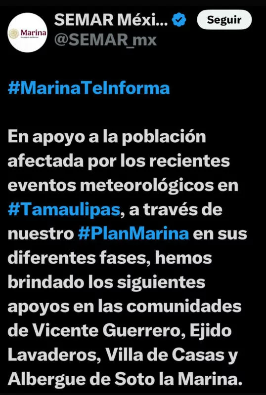 La Secretaría de Marina (SEMAR), como parte de las acciones del Plan Marina para apoyar a la población afectada por la tormenta tropical “Barry”, reportó el auxilio a 72 personas en cuatro comunidades del estado de Tamaulipas: Vicente Guerrero, Ejido Lavaderos, Villa de Casas y el albergue de Soto la Marina.