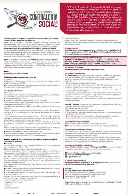 Ciudad Victoria, Tamaulipas.- A fin de promover la vigilancia ciudadana en la gestión pública para fomentar la transparencia y rendición de cuentas que incide en evitar actos de corrupción, la Contraloría Gubernamental del Estado de Tamaulipas a cargo de Norma Angélica Pedraza Melo, da a conocer la convocatoria del “ V Premio Estatal de Contraloría Social”, donde pueden participar Comités de Contraloría Social, Organizaciones de la Sociedad Civil y a la sociedad en general con actitud solidaria hacia la comunidad.