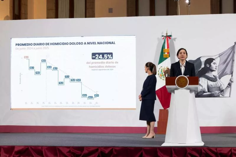 La incidencia delictiva hasta el 30 de junio de 2025 muestra una disminución muy destacada en los homicidios dolosos a nivel nacional, con un promedio de 65.6 homicidios diarios en junio, lo que representa una reducción del 24.5 % en comparación con septiembre de 2024.