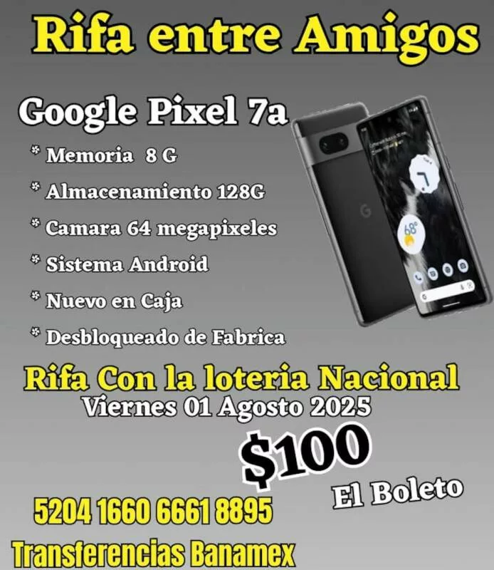 Se ofrecerá el sorteo en rifa de un teléfono de alta gama Google Pixel 7 en su caja, teniendo el boleto un costo de 100 pesos.