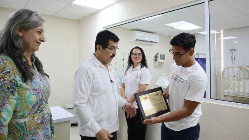 En otra parte de su visita, convivió con estudiantes de la unidad académica, quienes le entregaron un reconocimiento como padrino de las generaciones 2025 de las licenciaturas en Enfermería, Seguridad, Salud y Medio Ambiente y Psicología, así como de la generación 2024 de las maestrías en Enfermería y Psicología Clínica y Educativa.