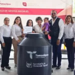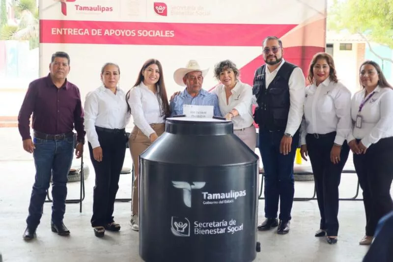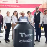 La secretaria de Bienestar Social, Silvia Casas González, junto a la presidenta municipal, Sindy Paoleth Monita Ramírez, encabezó un evento en la plaza principal de ese municipio del altiplano tamaulipeco, en el que se hizo entrega de 70 tinacos con capacidad de 600 litros para el almacenamiento de agua.