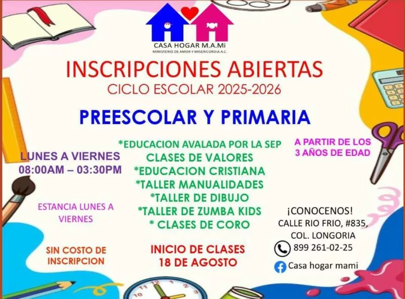 Sin costo alguno de inscripción, y con el único propósito de apoyar a los padres de familia que trabajan con servicio de guardería temporal o permanente, asi como educación preescolar y primaria. Casa Hogar “Mami” abrió su proceso de inscripciones para el ciclo 2025-2026.