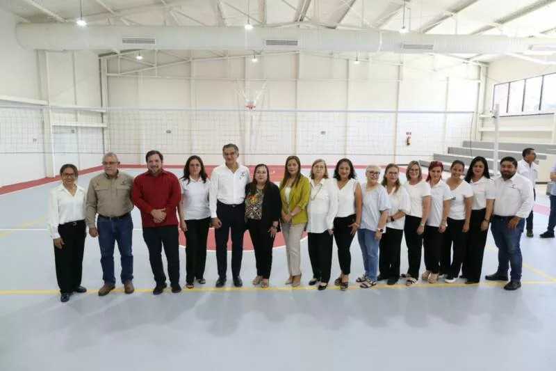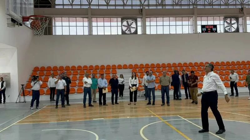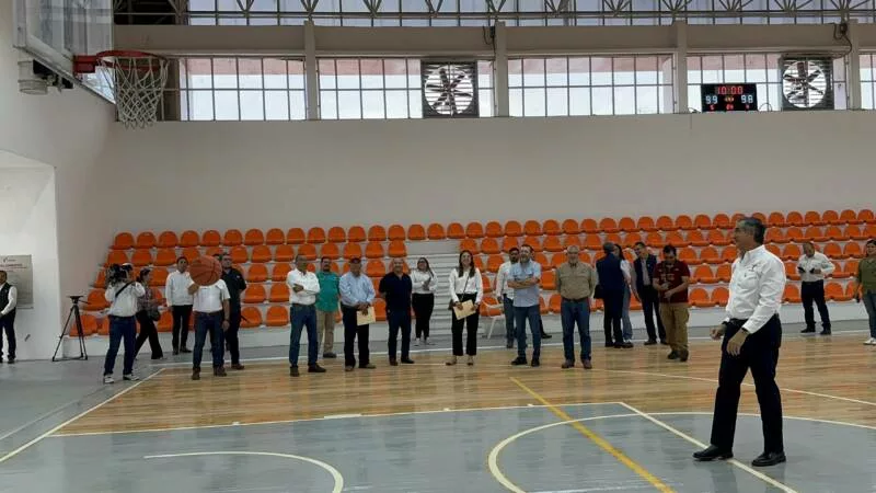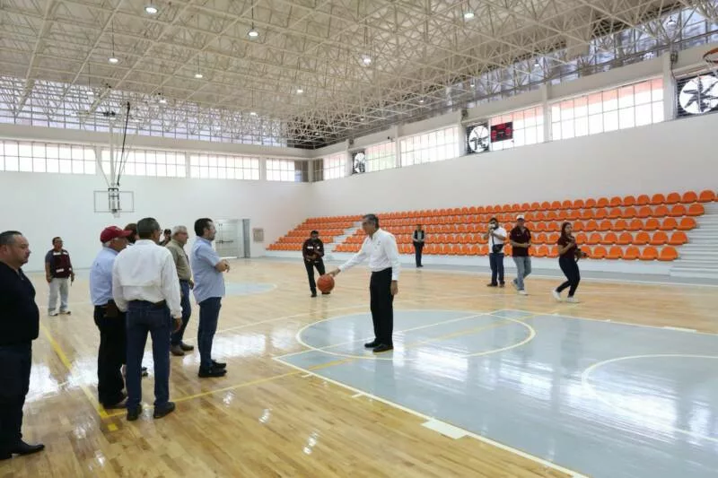 Villarreal Anaya también constató la rehabilitación del gimnasio Manuel Raga Navarro, donde se llevan a cabo acciones diversas como la colocación de duela de maple en cancha de basquetbol profesional, rehabilitación de puertas metálicas y de aluminio, cambio de luminarias, instalación de un sistema de ventilación y extracción de aire, así como aplicación de sistema aislante térmico en la cubierta de lámina en el exterior. Estos trabajos suman un monto de 6 millones 62 mil 764 pesos y tienen un 93 por ciento de avance.