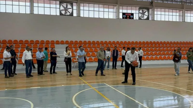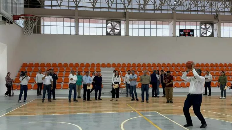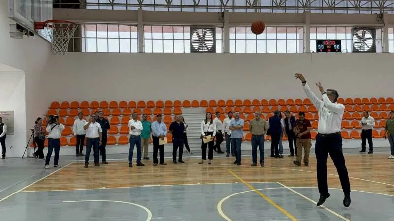 En un momento de su recorrido, el mandatario estatal realizó un tiro a la canasta en las nuevas canchas de basquetbol y logró encestar.
