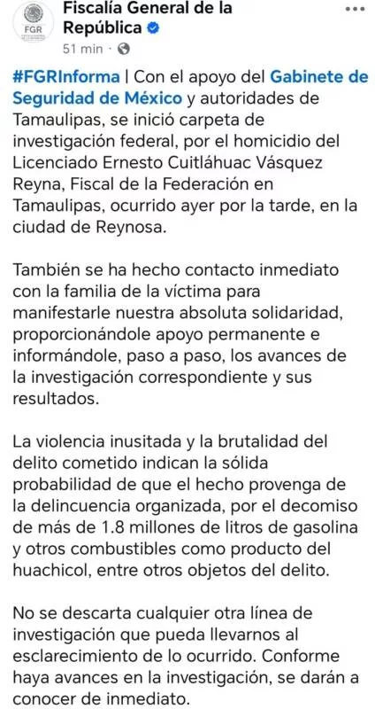 Unas horas después del atentado fatal ocurrido en Reynosa, en donde perdiera la vida Ernesto Cuitláhuac “N”. Delegado de la Fiscalía General de la Republica (FGR) en Tamaulipas. Se inició una carpeta de investigación en torno a estos hechos de violencia y en donde la dependencia plantea como una línea de investigación, represalias tras los decomisos de hidrocarburos ilícitos en la entidad.