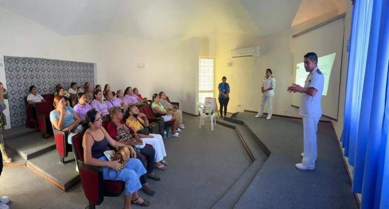 Las asistentes recibieron instrucción teórica y práctica en técnicas básicas de primeros auxilios, impartida por instructores de la Secretaría de Marina Armada de México y paramédicos de Protección Civil municipal.