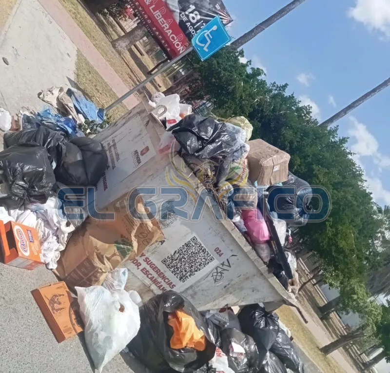 Entre la calle Mina y Guerra, las aceras son invadidas por montones de basura y desechos, que rebosan el contenido instalado en esta area.