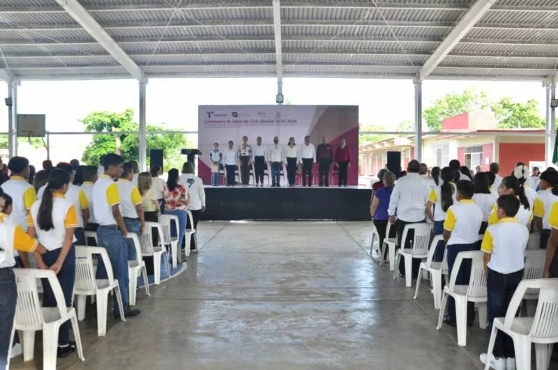 Tampico, Tamaulipas. — Con el mensaje del gobernador Américo Villarreal Anaya a alumnos y maestros de realizar el máximo esfuerzo y dar todo por el aprendizaje, el secretario de Recursos Hidráulicos, Raúl Quiroga Álvarez, inauguró, en representación del mandatario estatal, el ciclo escolar 2025-2026 en la secundaria 8 Profr. Rigoberto Castillo Mireles de Tampico.
