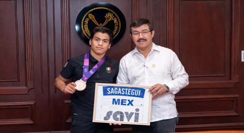 El rector de la Universidad Autónoma de Tamaulipas (UAT), Dámaso Anaya Alvarado, recibió en sus oficinas al estudiante y deportista de alto rendimiento, Eduardo Sagastegui Becerra, alumno de la Unidad Académica Multidisciplinaria Valle Hermoso (UAMVH), quien, recientemente, regresó de los Juegos Panamericanos Junior Asunción 2025, donde obtuvo medalla de bronce en la categoría -60 kg de judo.