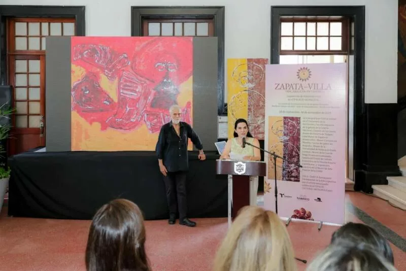 Asimismo, explicó que el título de la muestra —“Zapata-Villa Descabalgan en Tampico”— alude a un episodio histórico poco conocido, cuando los carrancistas impidieron al general Francisco Villa desmontar su caballería en esta ciudad. Además, el artista rinde homenaje a su abuelo, el coronel Conrado López Castillo, en varias de las piezas exhibidas.