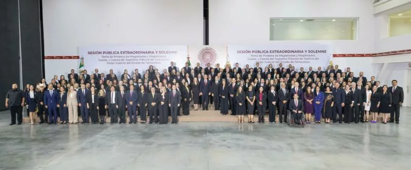 Ciudad Victoria, Tamaulipas. - En un acto inédito e histórico, que fortalece al Estado, a las instituciones, y que marca el inicio de una nueva era de legalidad y justicia en Tamaulipas, el gobernador Américo Villarreal Anaya atestiguó la toma de protesta de las y los juzgadores que integran el nuevo Poder Judicial, y que convierte a Tamaulipas en unos de los primeros estados del país que elige a sus tres Poderes, democráticamente, por voto directo y secreto del pueblo.