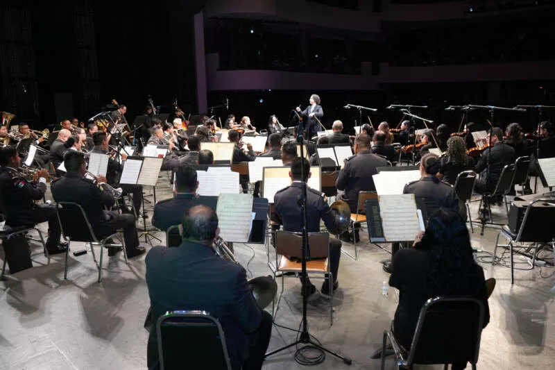 Bajo la dirección del maestro Remigio Reyes González, la Orquesta Sinfónica de Alientos brindó un programa lleno de energía e identidad nacional, que incluyó arreglos sinfónicos de música mexicana. Posteriormente, la Banda de Guerra de la Coordinación Territorial Región Golfo de la Guardia Nacional se presentó con un despliegue de fuerza y precisión.