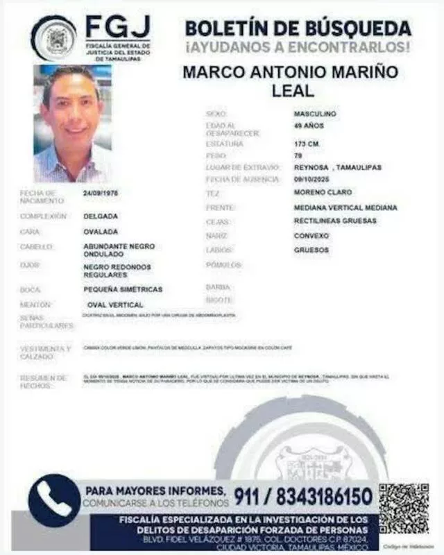La Fiscalía General de Justicia del Estado de Tamaulipas informa que, desde que se tuvo conocimiento del reporte de no localización de Marco Antonio Mariño Leal, el pasado 10 de octubre, la Fiscalía Especializada en la Investigación de los Delitos de Desaparición Forzada de Personas (FEIDDFP) inició una investigación y puso en marcha acciones de búsqueda en coordinación con la Guardia Nacional, Guardia Estatal y Comisión Estatal de Búsqueda Tamaulipas.