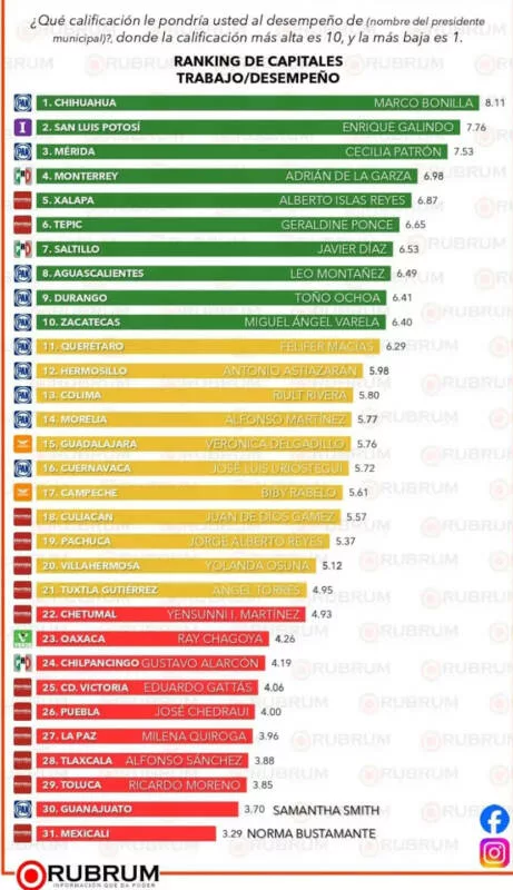 Cabe mencionar que el alcalde de Chihuahua Capital, Marco Bonilla, se posicionó como el presidente municipal mejor evaluado a nivel nacional en desempeño, al obtener 7.56 puntos en esta encuesta, seguido por Enrique Galindo, alcalde de San Luis Potosí, y de Adrián de la Garza, de Monterrey, que de acuerdo a este ejercicio sí gozan de una gran aceptación entre los ciudadanos de sus respectivos municipios.