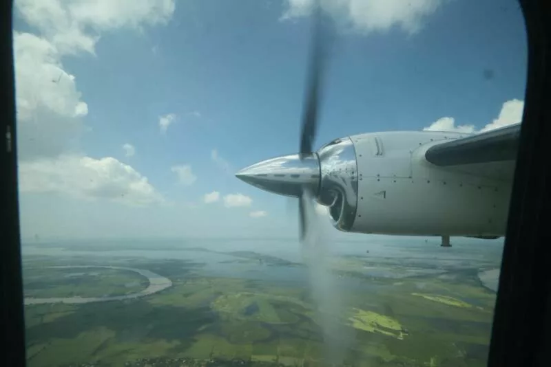 Tampico, Tamaulipas.- El gobernador Américo Villarreal Anaya realizó un sobrevuelo para supervisar la creciente que registra el cauce del río Pánuco y reiteró que el gobierno de Tamaulipas está atento y debidamente preparado para brindar toda la atención a las familias que lo requieran en la zona conurbada.