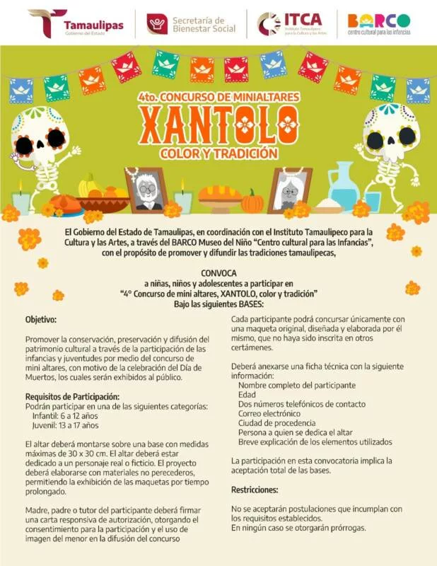 Tampico, Tamaulipas.-Para conmemorar el Día de Muertos, una de las celebraciones más emblemáticas de México; el Gobierno del Estado de Tamaulipas, a través del Instituto Tamaulipeco para la Cultura y las Artes y el centro cultural para las infancias BARCO, llevará a cabo una jornada de actividades culturales, artísticas y familiares en el sur del estado, por lo que invitan a las comunidades de Tampico y municipios cercanos a participar en las diversas actividades como el Concurso de Mini Altares.