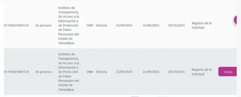 En uno de los casos, ya se presentó una queja formal ante la misma Plataforma Nacional de Transparencia, registrada bajo el folio 281198425000t36.